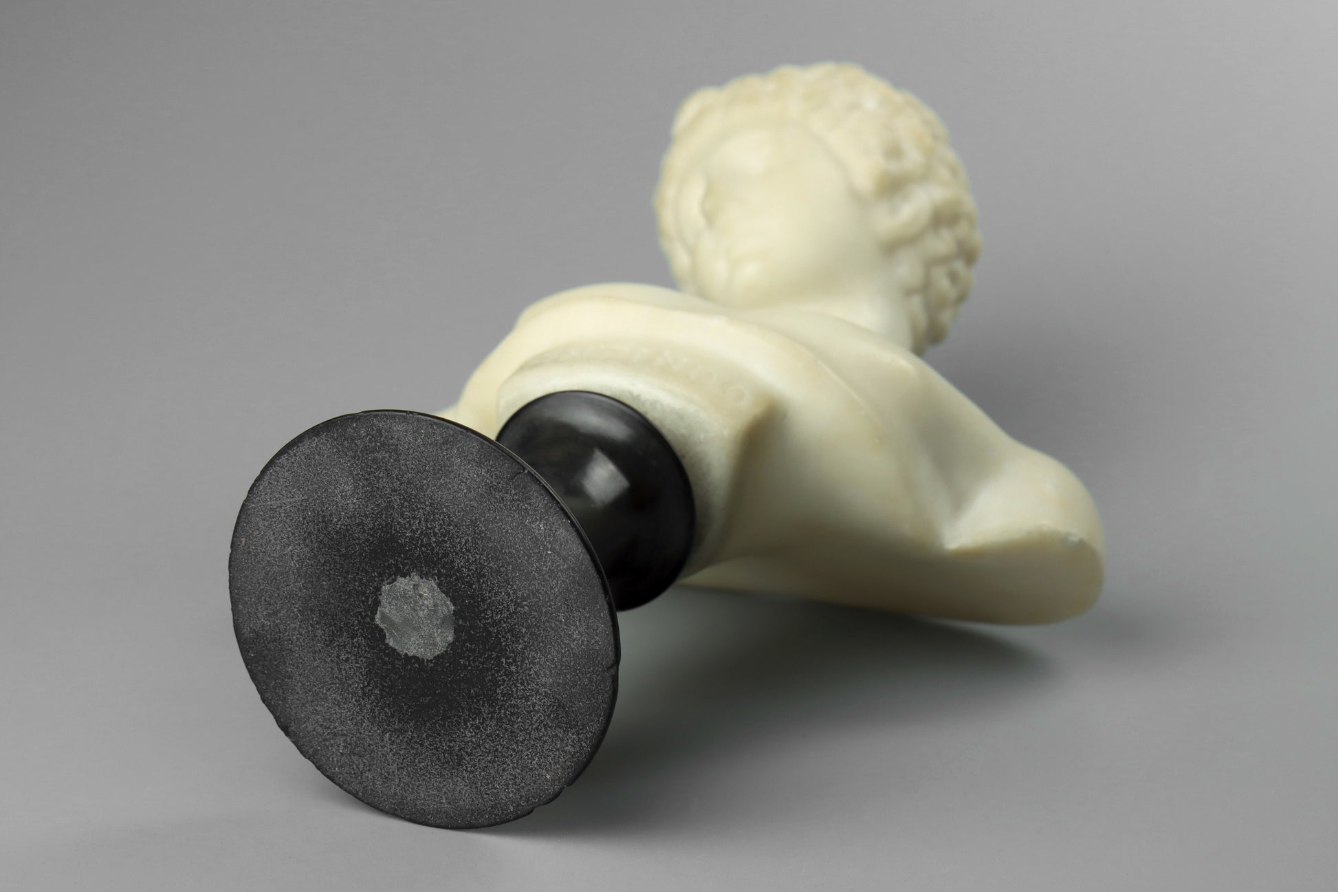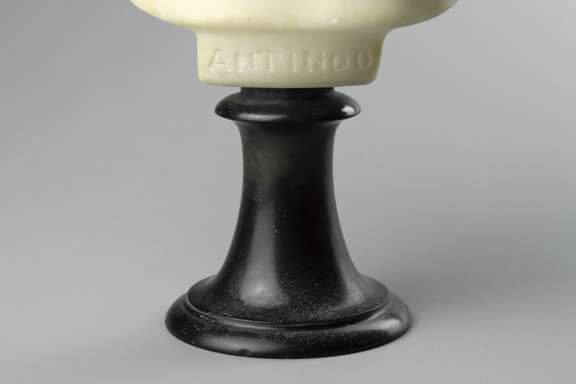 A carved alabaster bust of Antinous, dating to the late 19th century. This finely carved bust depicts the head and torso of Antinous posed in a downward gaze. This statue is known as “The Capitoline Antinous” and is after a Roman full-standing marble statue that was discovered at Hadrian's Villa, Tivoli, during excavations circa 1720s. This is a wonderful alabaster bust and is fixed on a slate socle base.