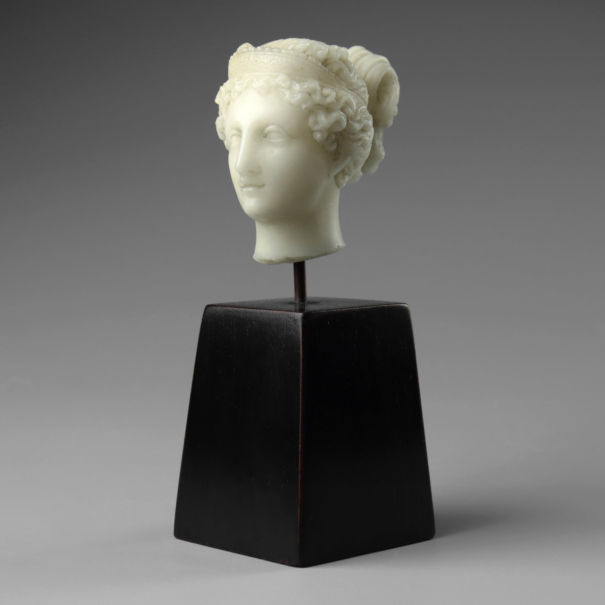 A carved alabaster head of a lady, probably Hebe, dating to the late 19th century. This finely carved head closely resembles and is likely after a statue of Hebe, the Greek goddess of youth and the daughter of Zeus, carved by Antonio Canova (1757–1822). The fragmentary condition suggests this was once part of a larger bust or statue and has been later presented on an ebonised wood base that can be removed. This is a curious little piece that is finely carved with good detail and the presentation gives it great decorative appeal.