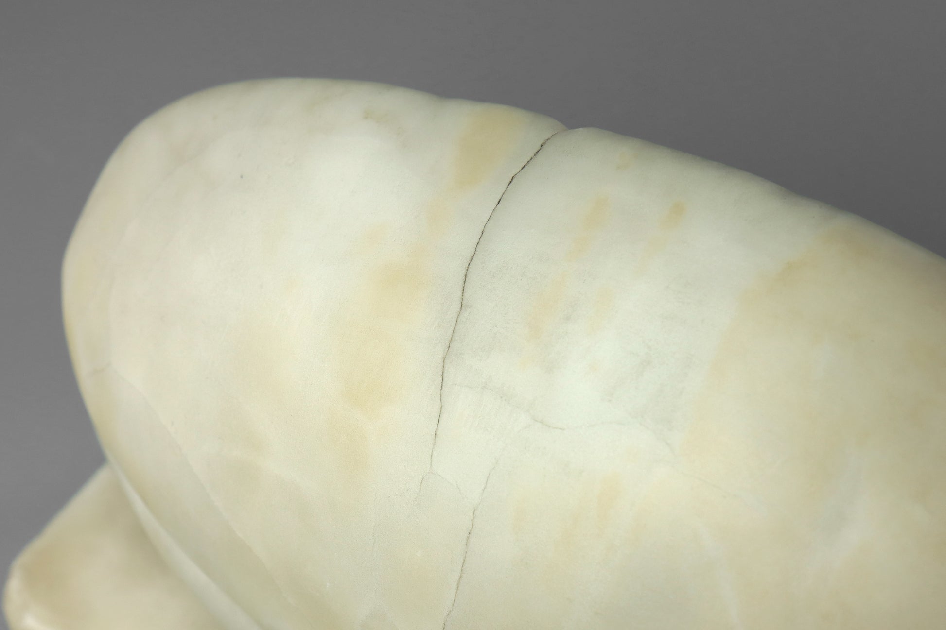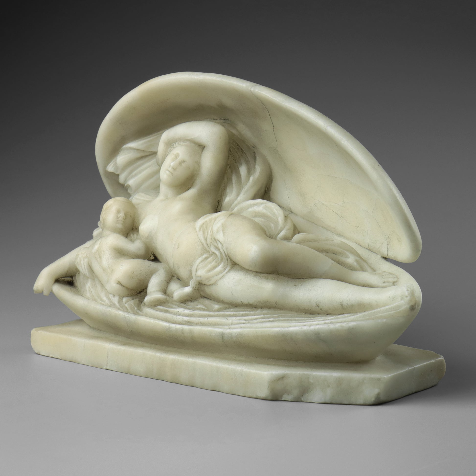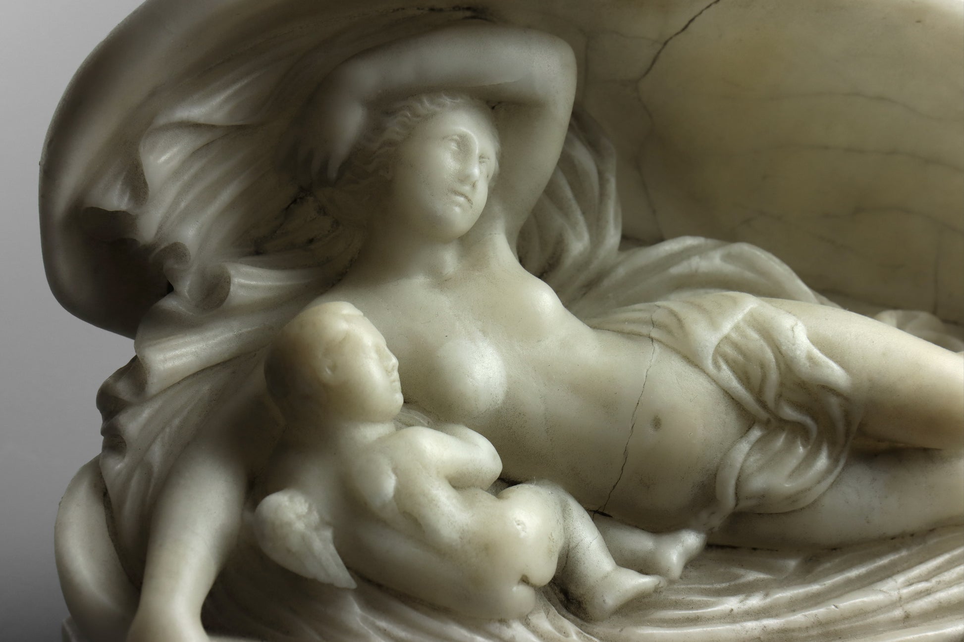 A carved alabaster statue of the “The Birth of Venus”, dating to the second half of the 19th century. This finely carved statue depicts Venus nude and reclining in a large shell with a winged Cupid by her side. This statue is after a bronze by Jacques Pradier (1790-1852) that was created circa 1838. This is a wonderful subject and rare to be found carved in alabaster. The piece has been finely carved with great attention to detail and has a good colour and patina.