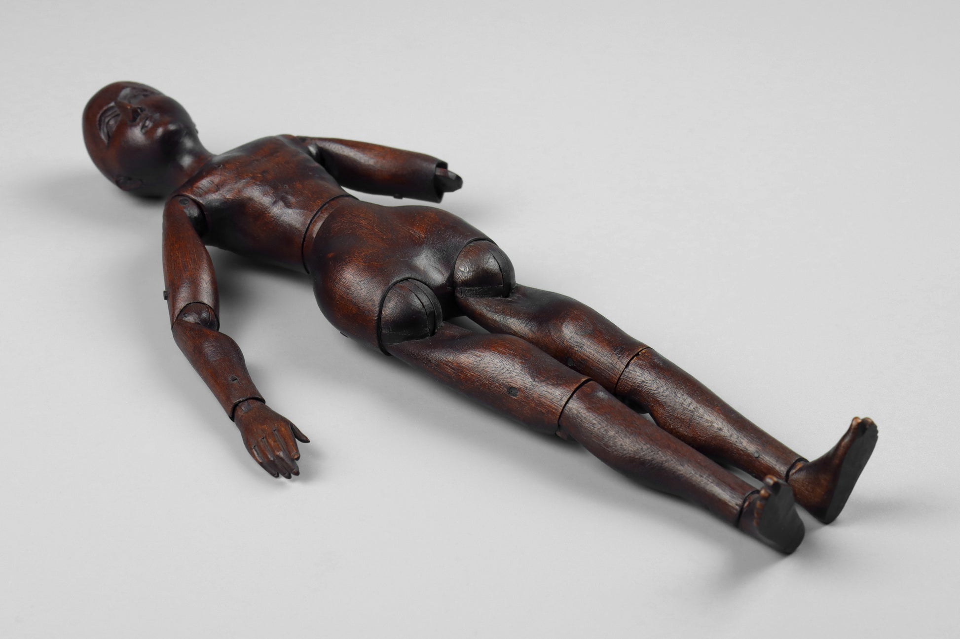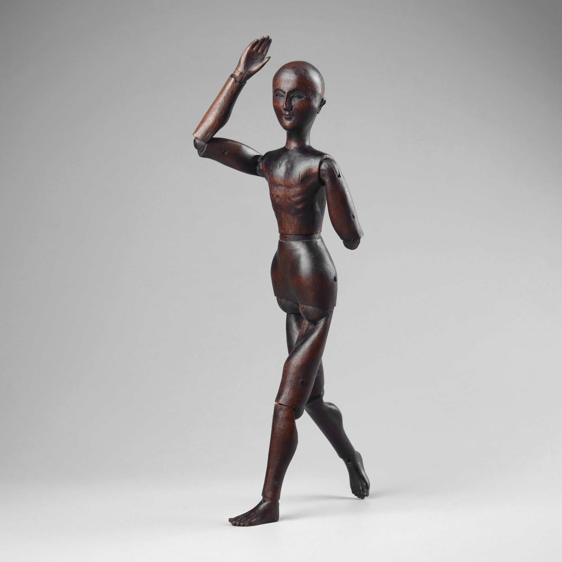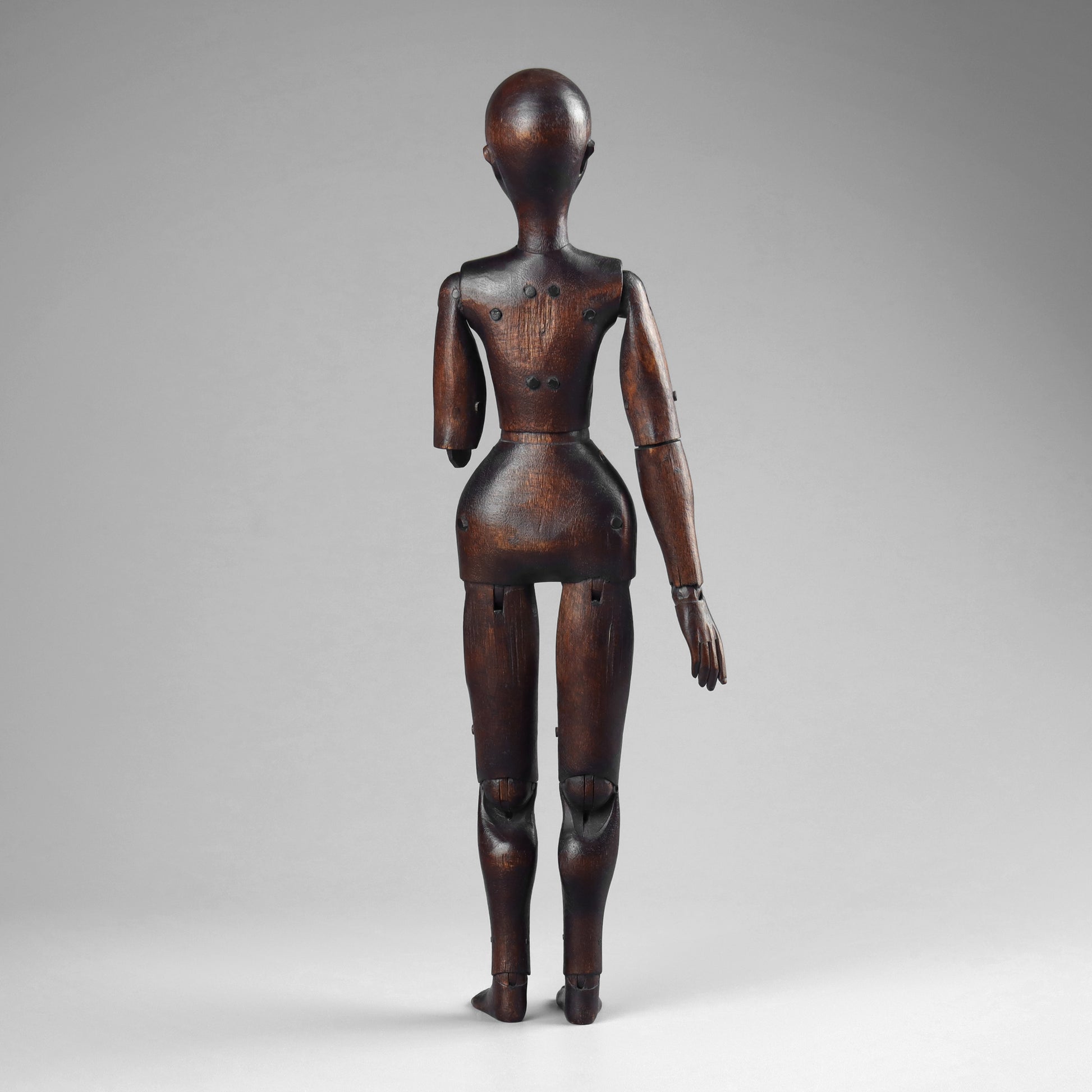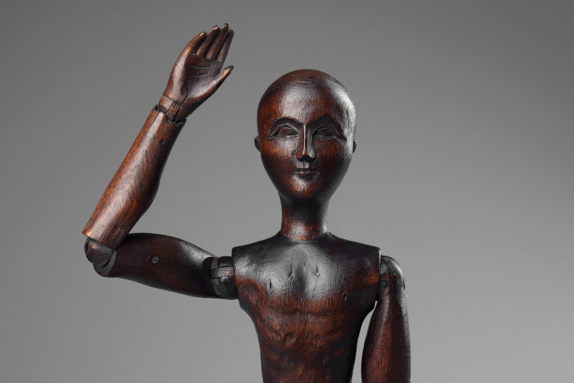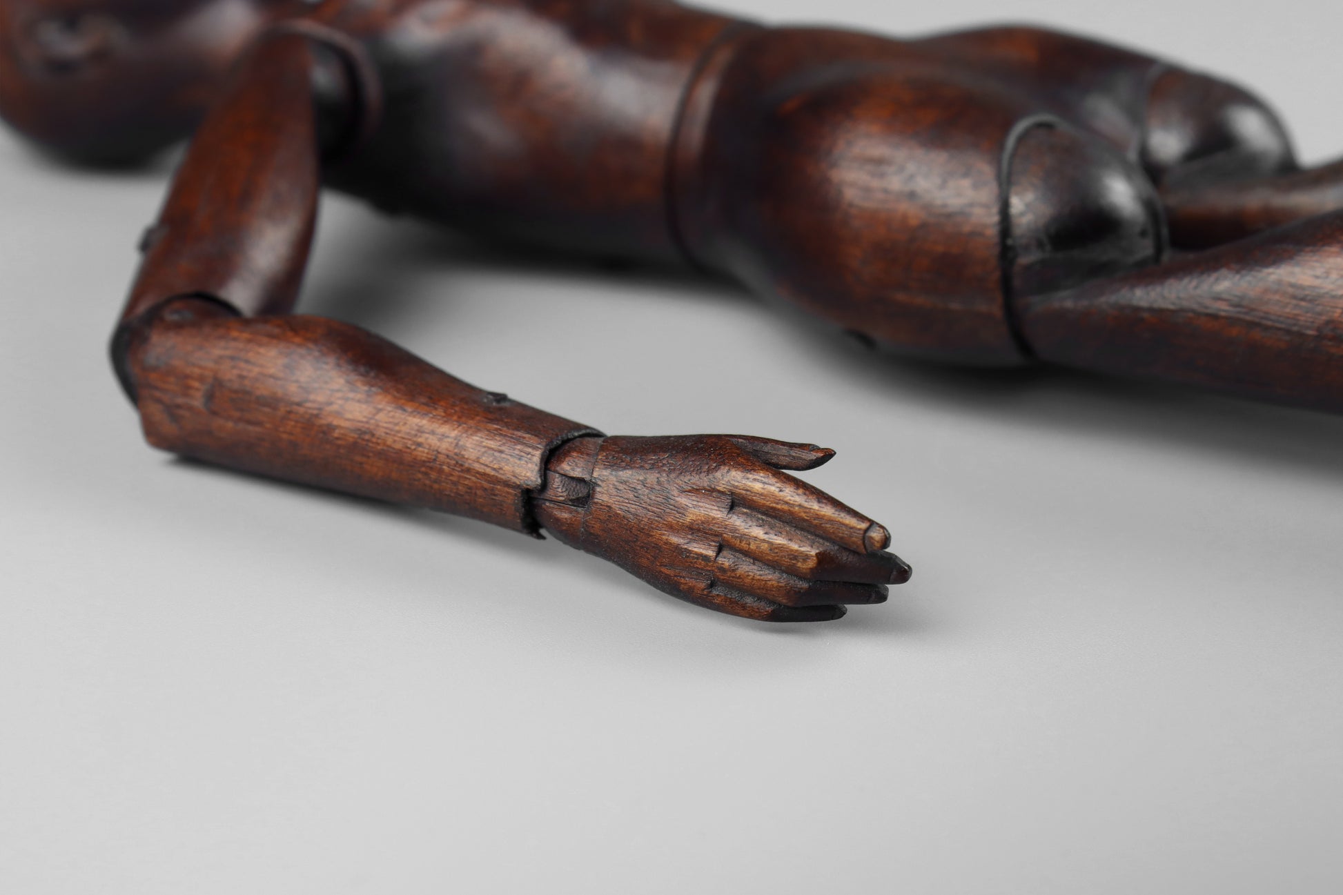 A carved & stained pine artist's lay figure, dating to the second half of the 19th century. Articulated with moveable joints and finely carved with good detailing to the face, hands and feet. The carved details include eyebrows, fingernails, toenails, and elegantly posed fingers. The lay figure has an attractive colour and patina.