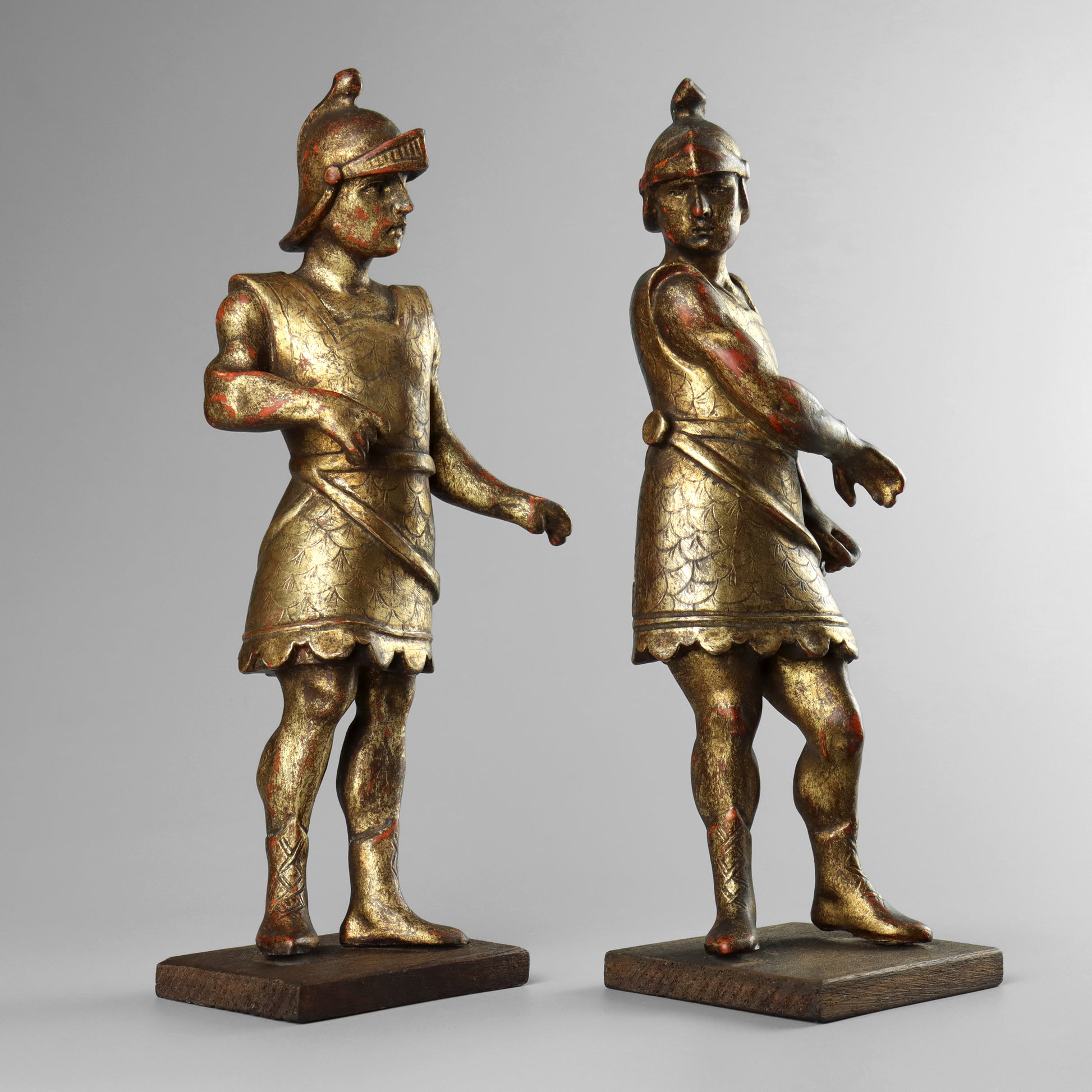 A pair of carved giltwood statues of Roman soldiers, dating to the late 19th century. This interesting pair of statues depict two Roman soldiers in military uniform and about to draw swords (missing). Each statue is finely carved and gilded with a distressed finish that reveals the red bole colour beneath. I believe these were once mounted on an impressive piece of furniture as evidenced by peg holes on the reverse (since overpainted/gilded to match in) and have later been presented on wooden bases.