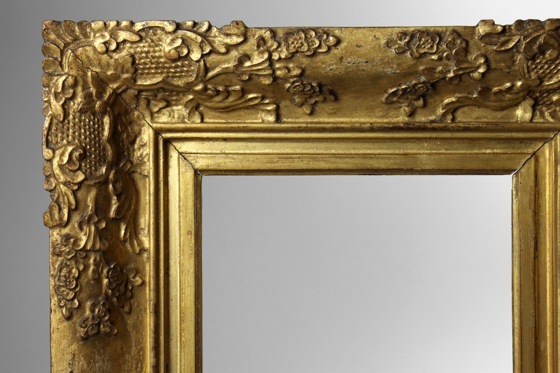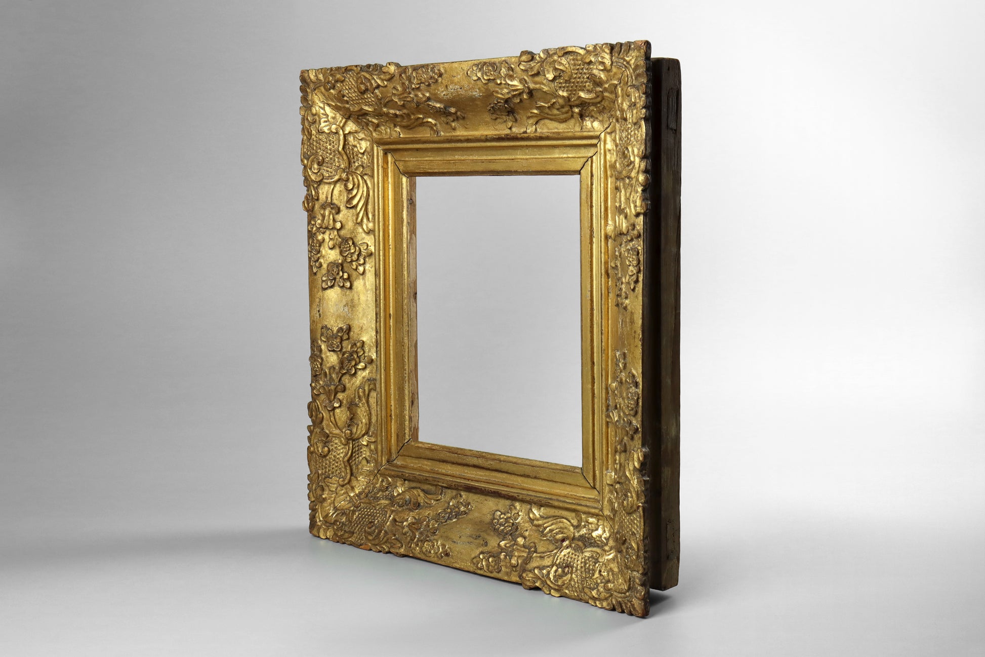 A carved and gilded frame, dating to the early 19th century. This is a good quality frame with finely carved scrolling acanthus leaves and flowers. The frame retains its original gilding that has a lovely finish/patina. The frame has two rebates to allow a pane of glass if needs be.