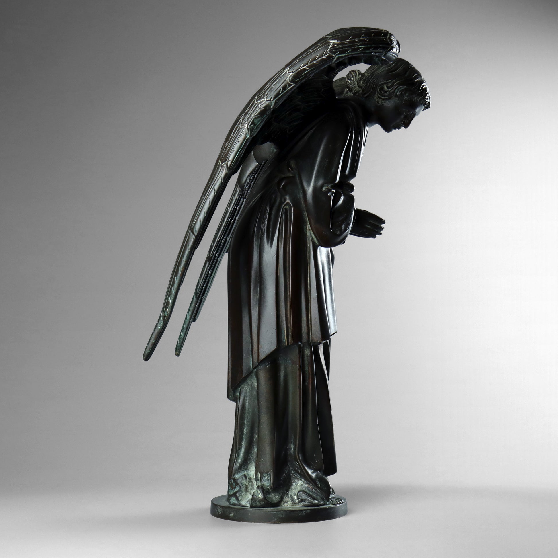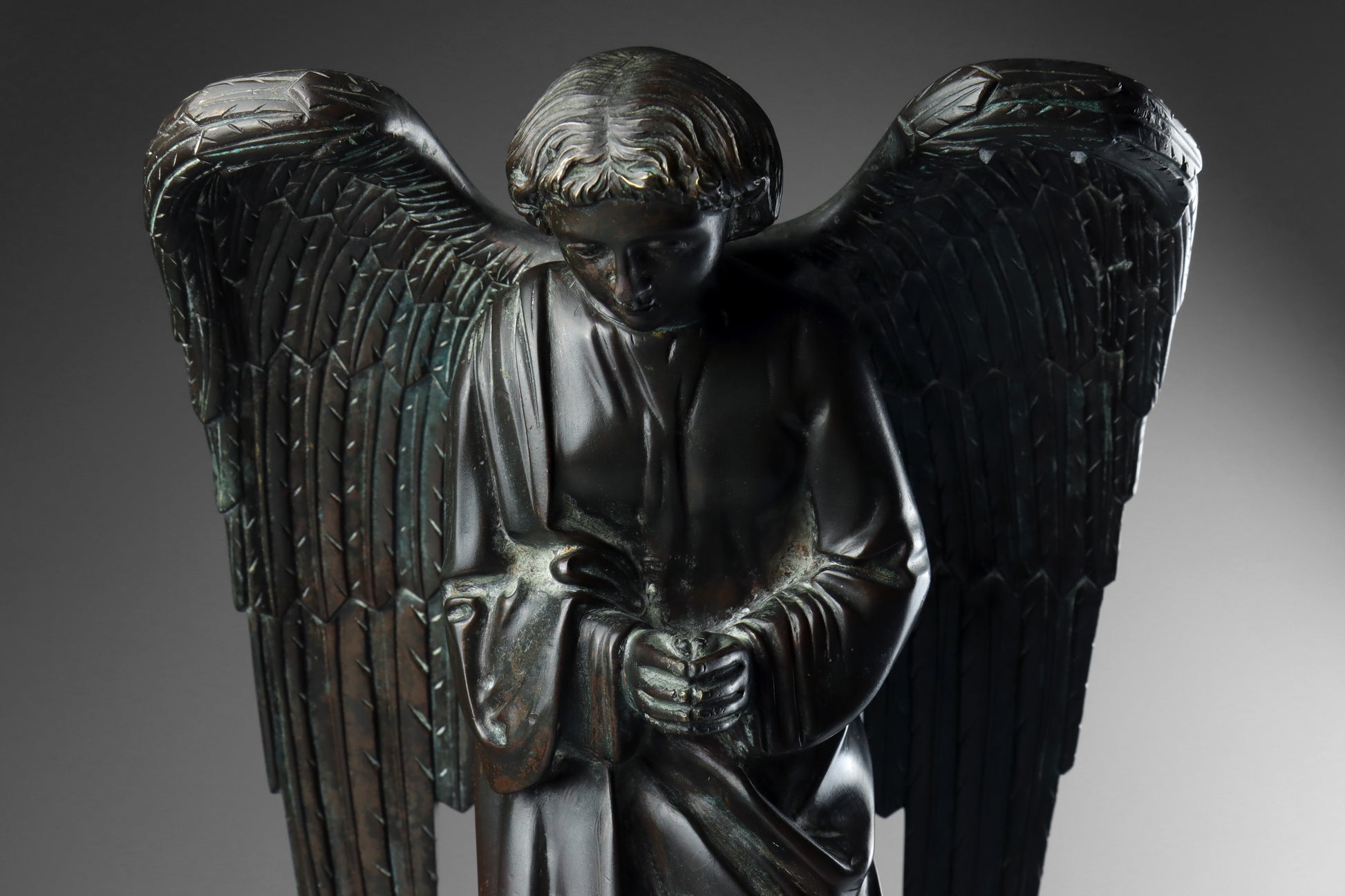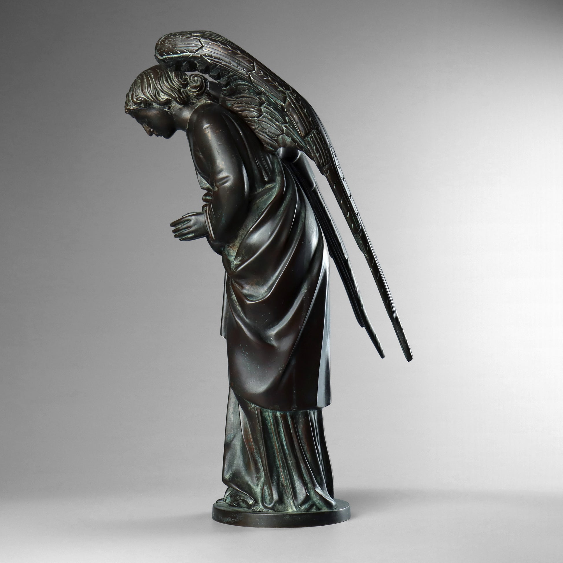 A bronze statue of an angel, dating to the 19th century. This finely cast bronze angel depicts an angel leant forward and hands in prayer. This statue was likely once the top of a lectern with holes on the reverse of the wings to hold the element of a bookrest or similar. The statue has developed a wonderful slightly verdigris patina that makes the piece highly decorative.