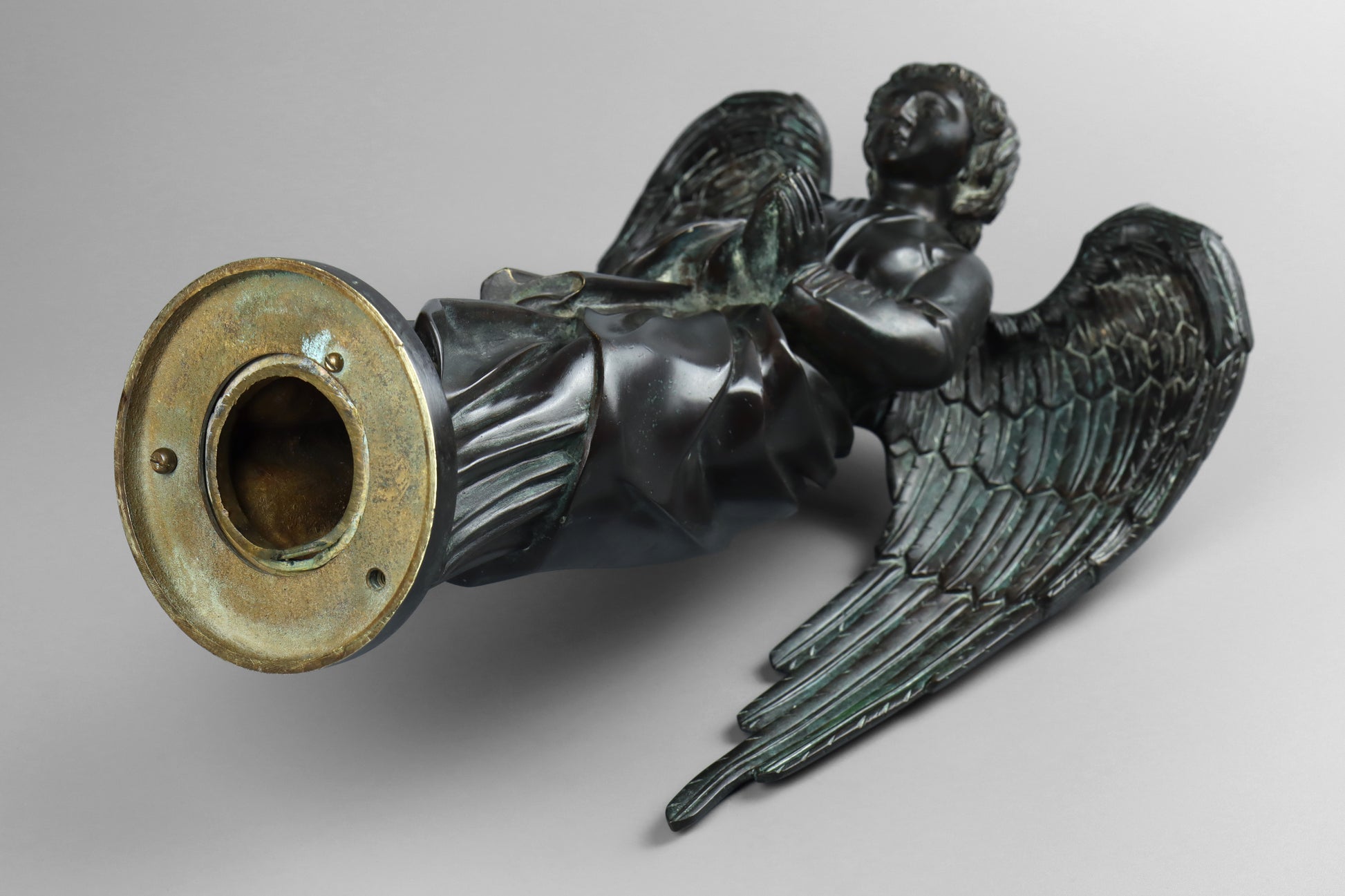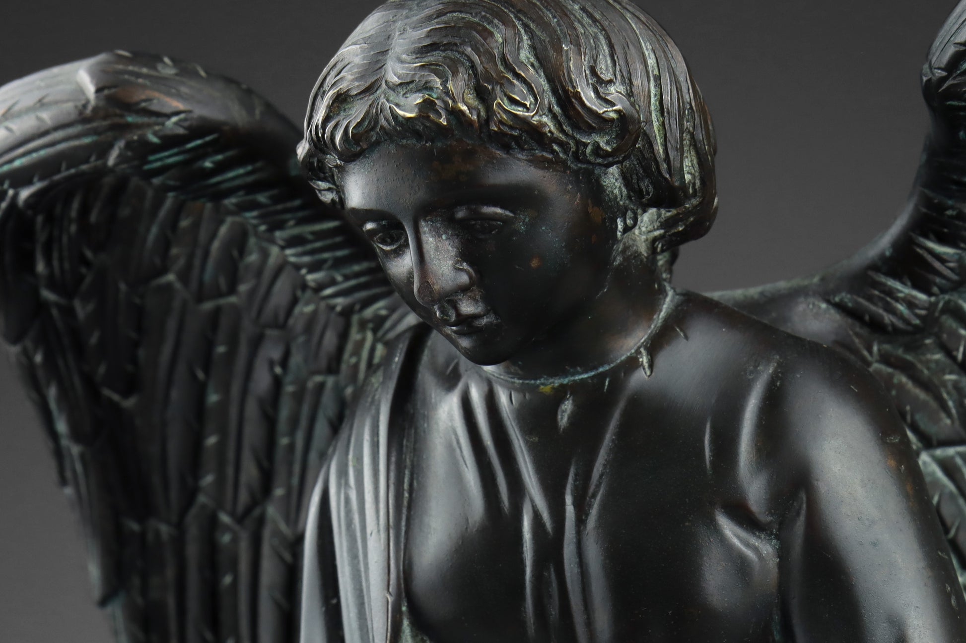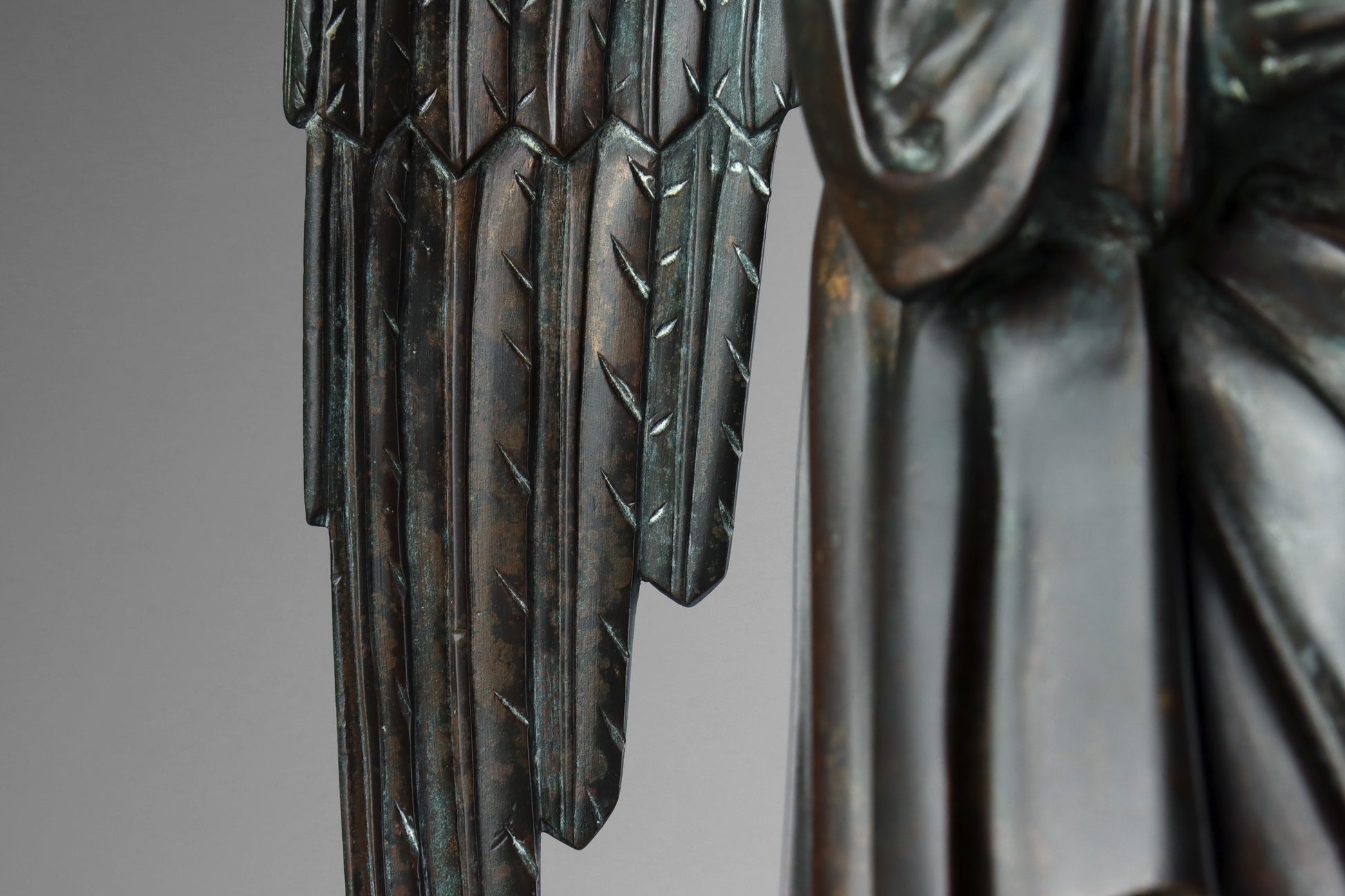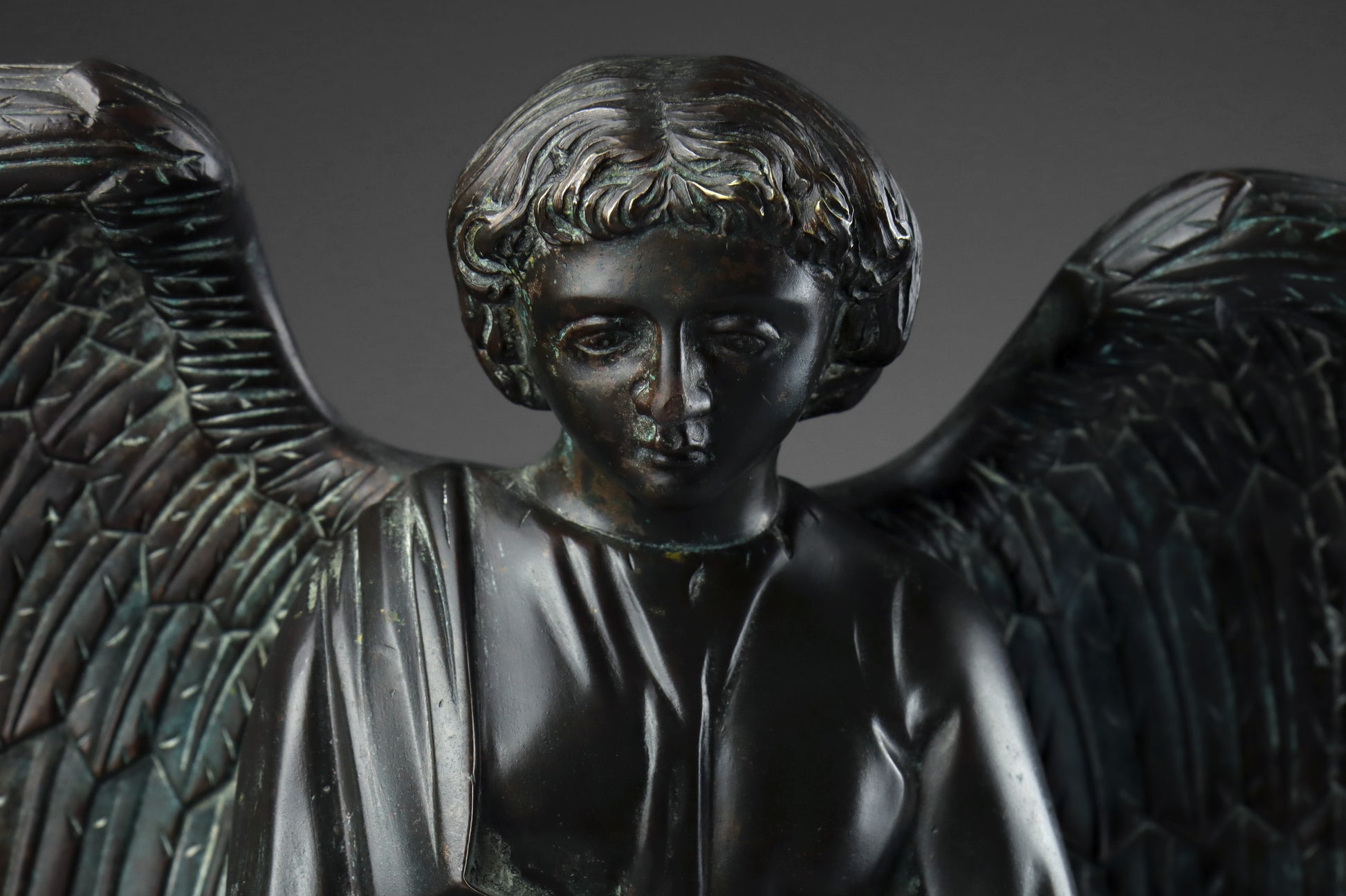 A bronze statue of an angel, dating to the 19th century. This finely cast bronze angel depicts an angel leant forward and hands in prayer. This statue was likely once the top of a lectern with holes on the reverse of the wings to hold the element of a bookrest or similar. The statue has developed a wonderful slightly verdigris patina that makes the piece highly decorative.