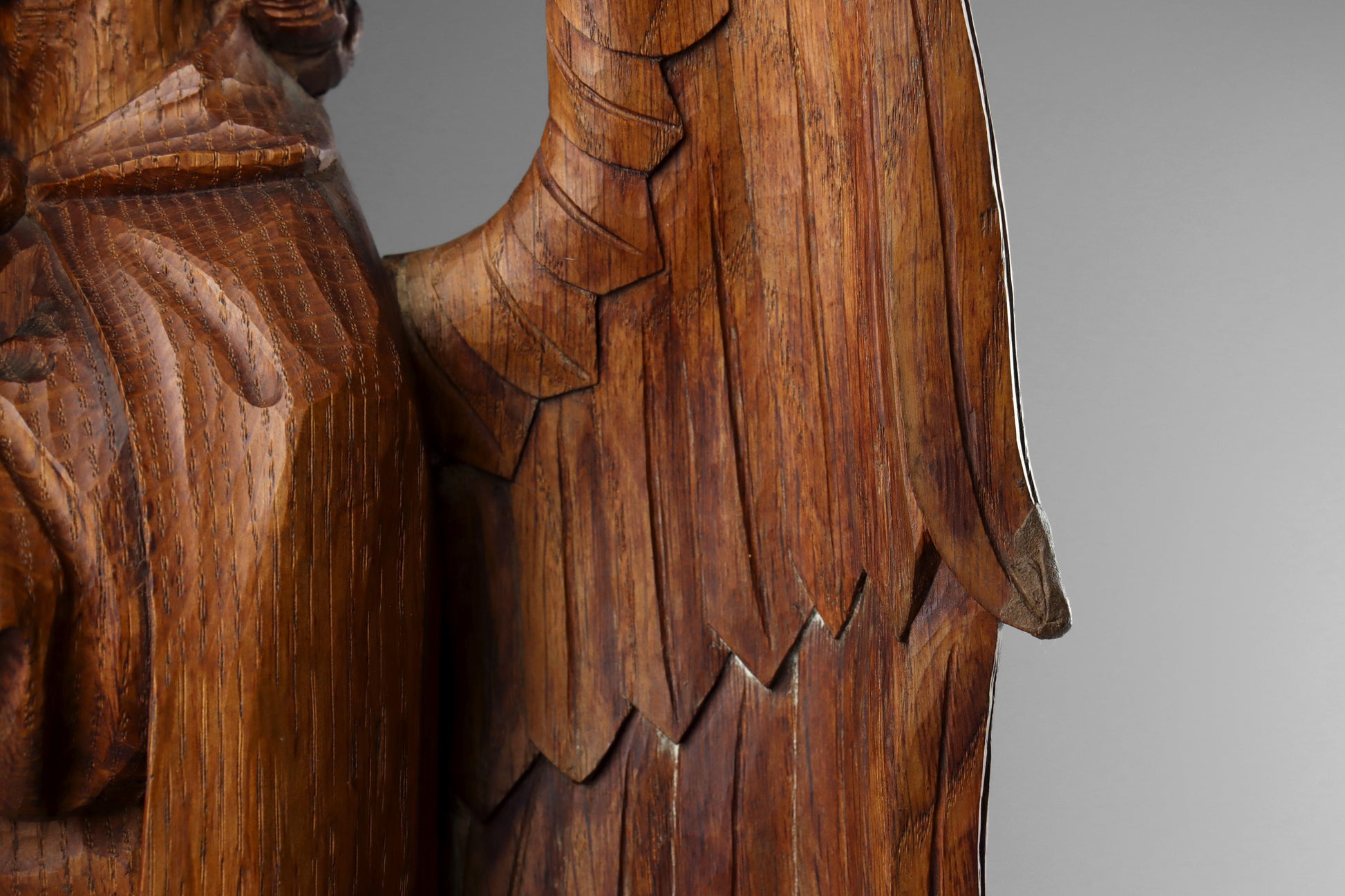 A carved oak statue of an angel, dating to the late 19th or early 20th century. This finely carved angel is in the gothic revival taste and depicts an angel playing a long trumpet. The piece is well carved and has a good colour and patina.