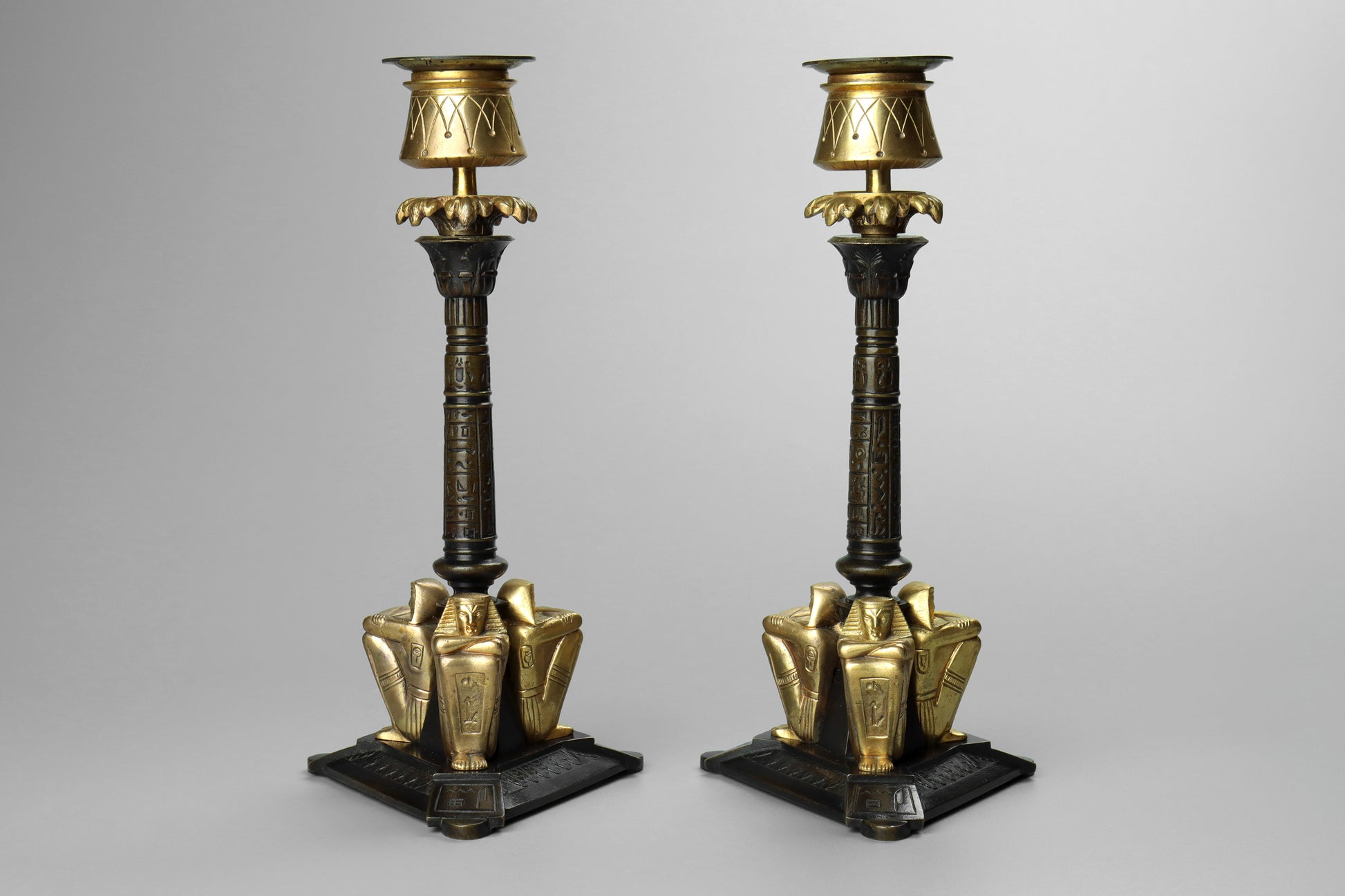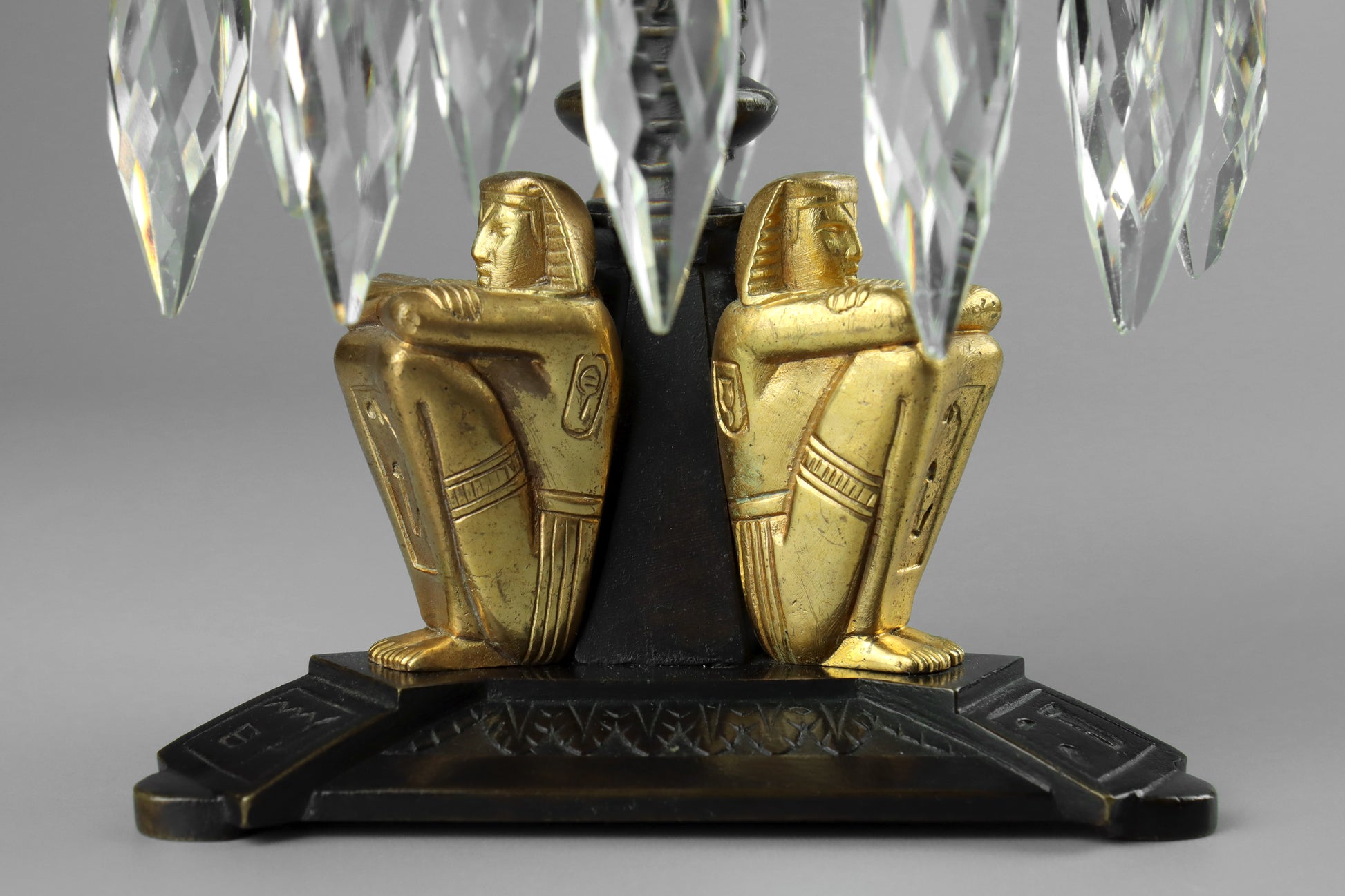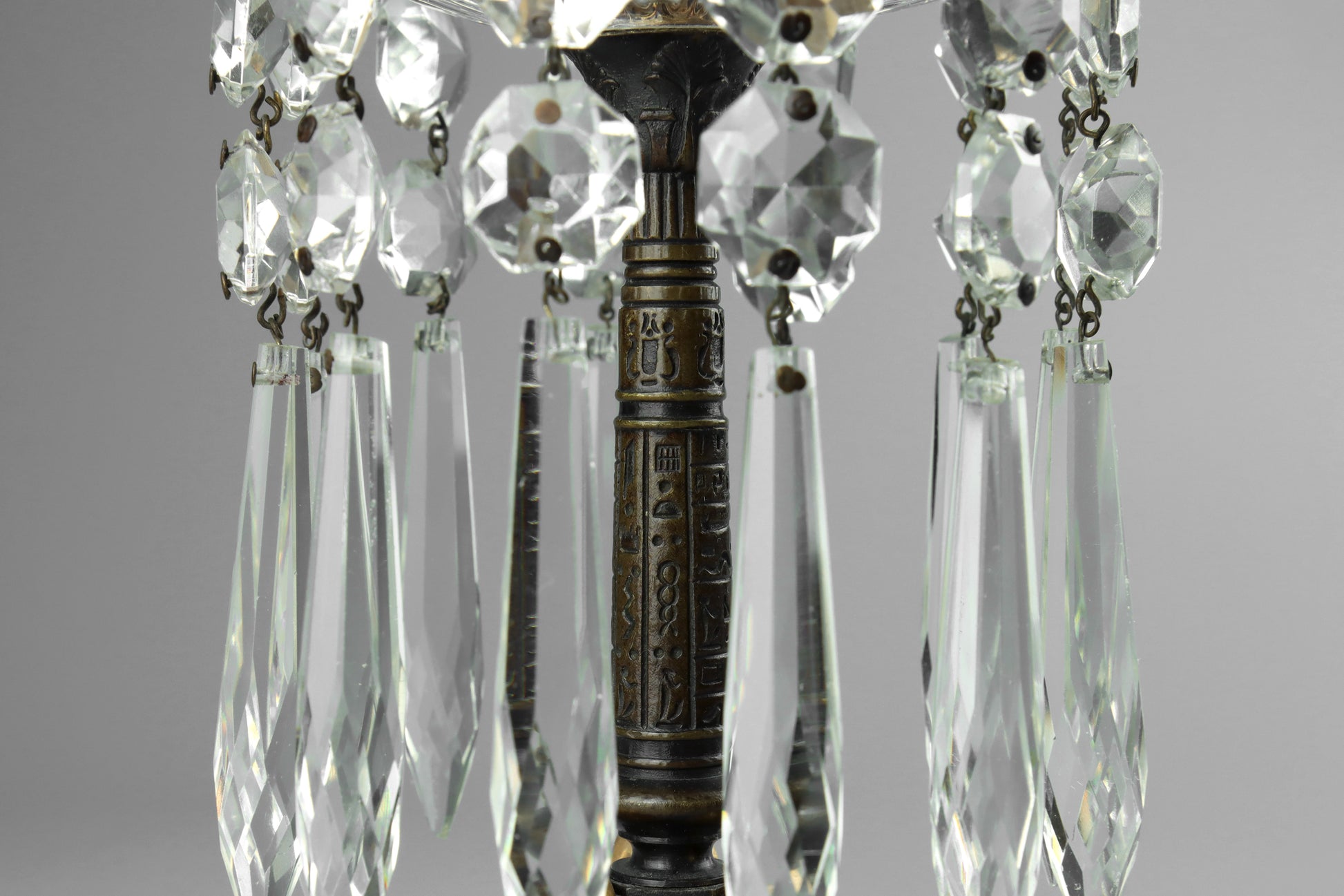 A pair of Egyptian revival bronze and glass lustre candlesticks, dating to the second half of the 19th century. Each candlestick constructed of a bronze column decorated with hieroglyphs, set upon a triform base with three gilt bronze seated Egyptian figures with headdresses. The gilt bronze sconces sit upon a cut-glass lustre tray with drops. These are a highly decorative pair of candlesticks however I believe the glass to be a later marriage as the way it sits between the stem and sconce doesn't seem “finished” - or perhaps an additional washer/spacer is missing. The glass can be removed but the length of the internal bolt leaves a small gap between the stem and sconce – not particularly noticeable but could easily be reduced by a competent restorer.