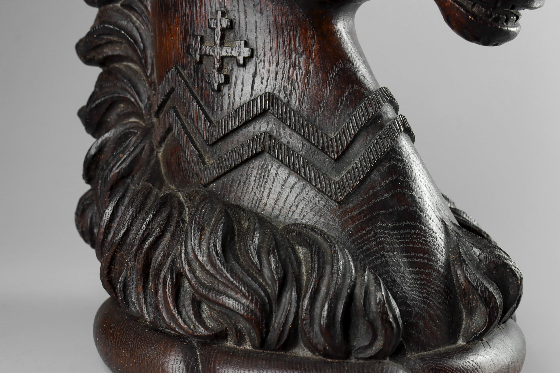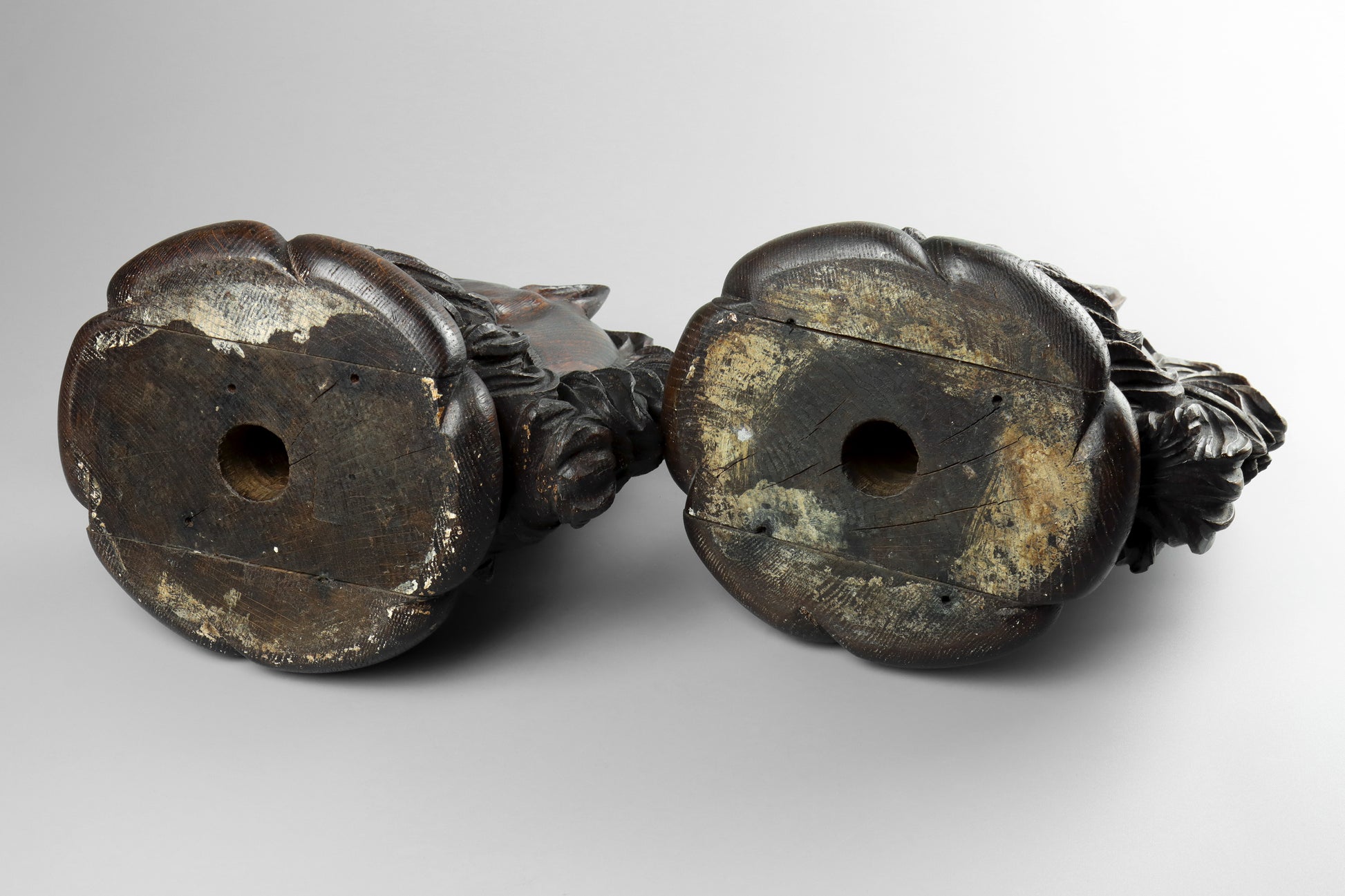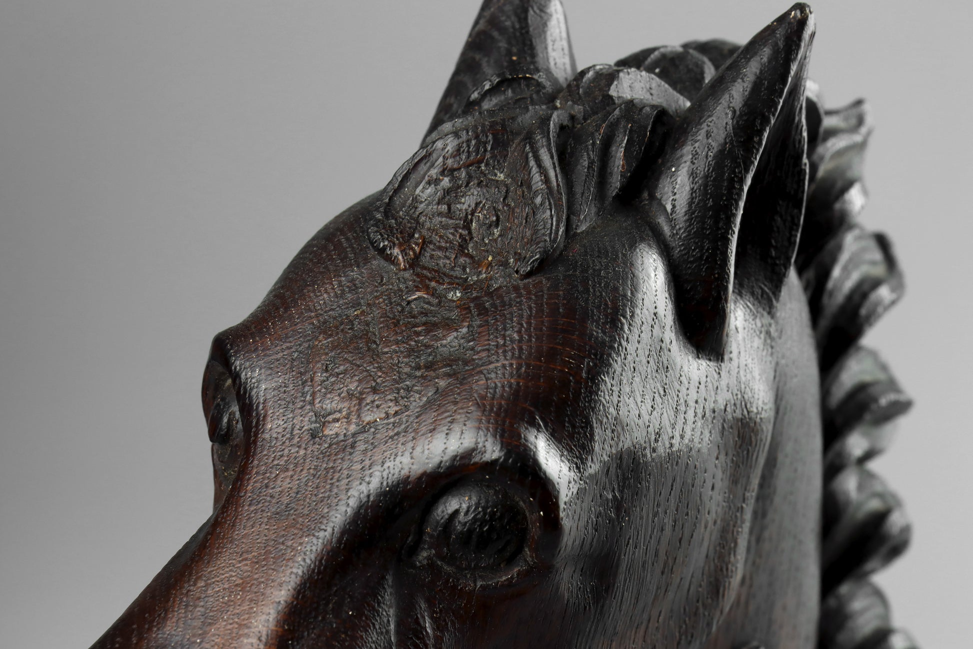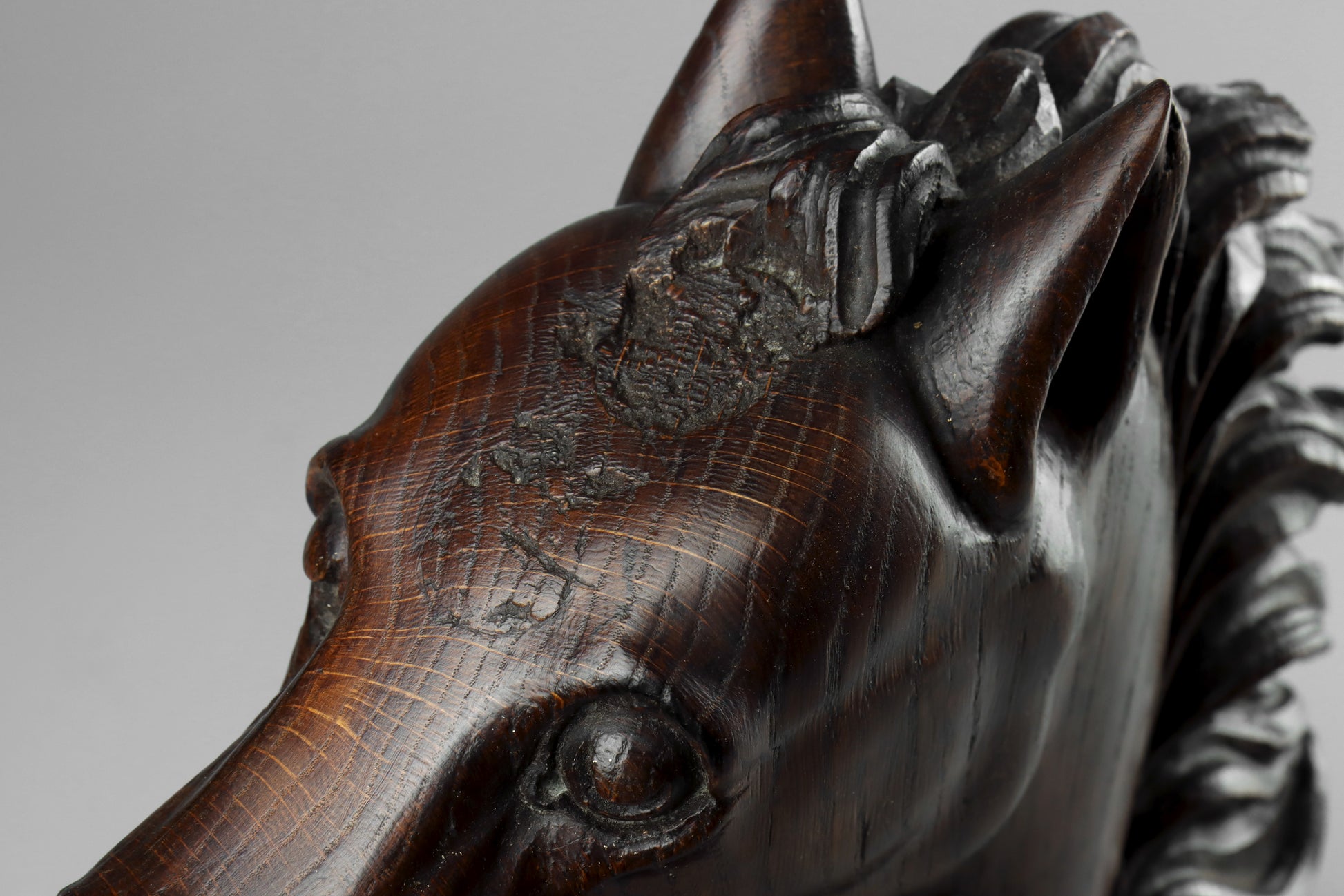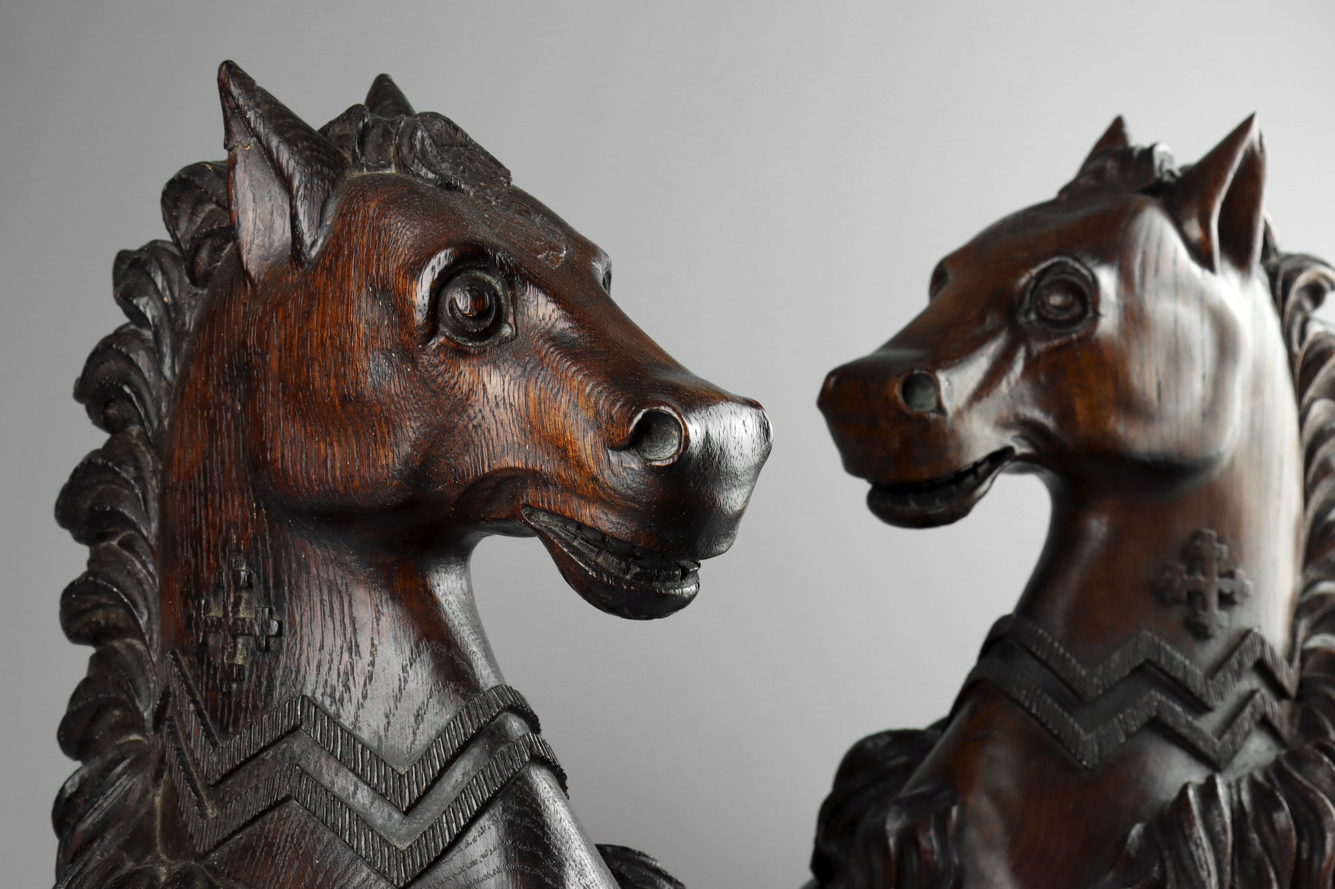 Two carved wood horse heads, dating to the second half of the 19th century. These wonderful carved horse heads are likely newel post finials with an armorial/stately connection with the raised bands of zig-zag lines and crosses carved on their necks. I believe these horse heads were originally unicorns and now lack the horns, as is evidenced by slightly rough patches on their heads where horns would've once been. Despite the lack of horns these now work great as just being horses and are beautifully carved and posed with their billowing manes. They both have a good rich colour and patina and are highly decorative.