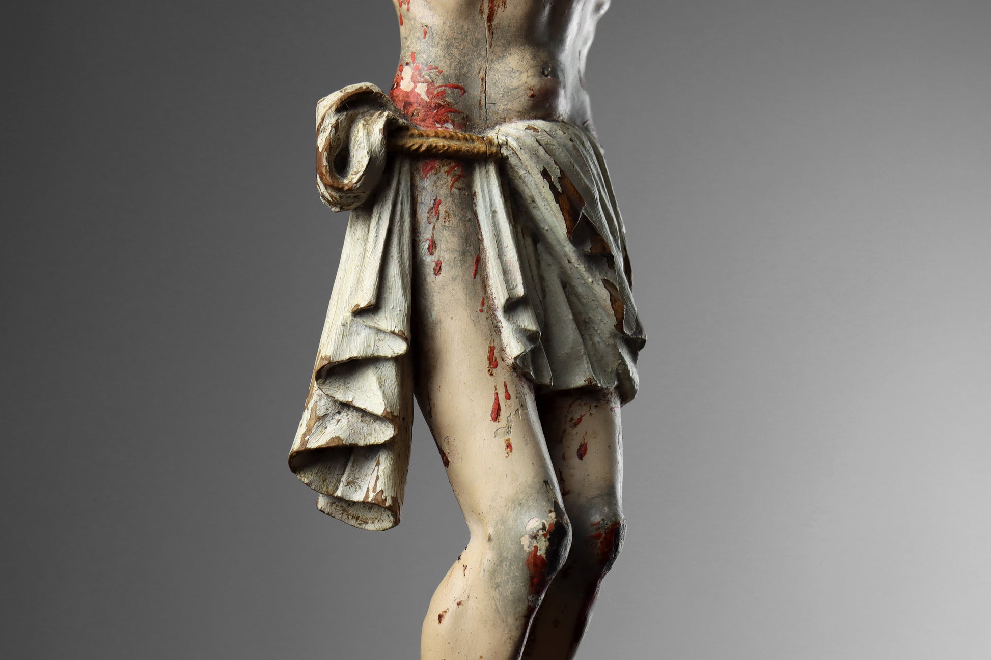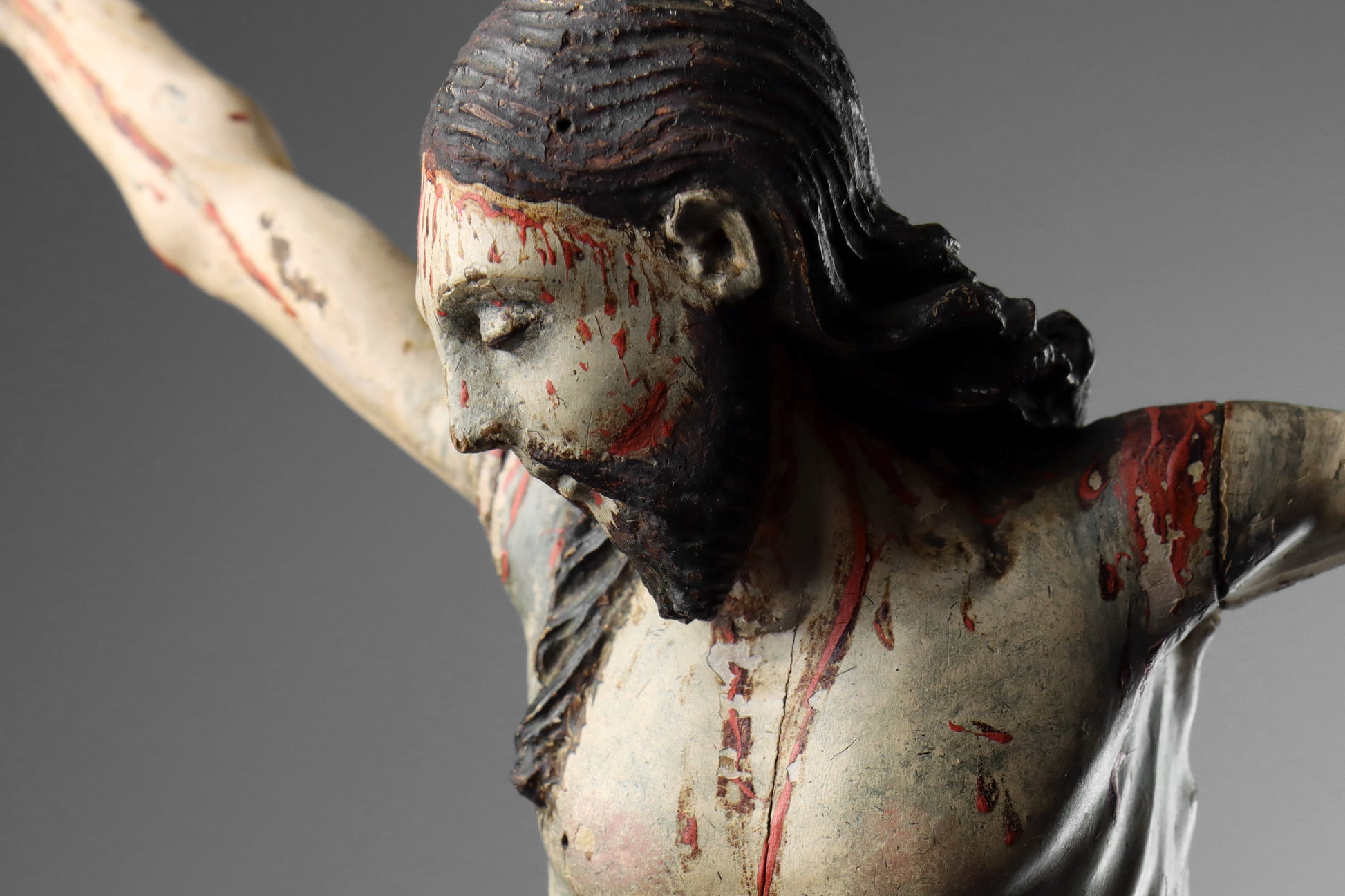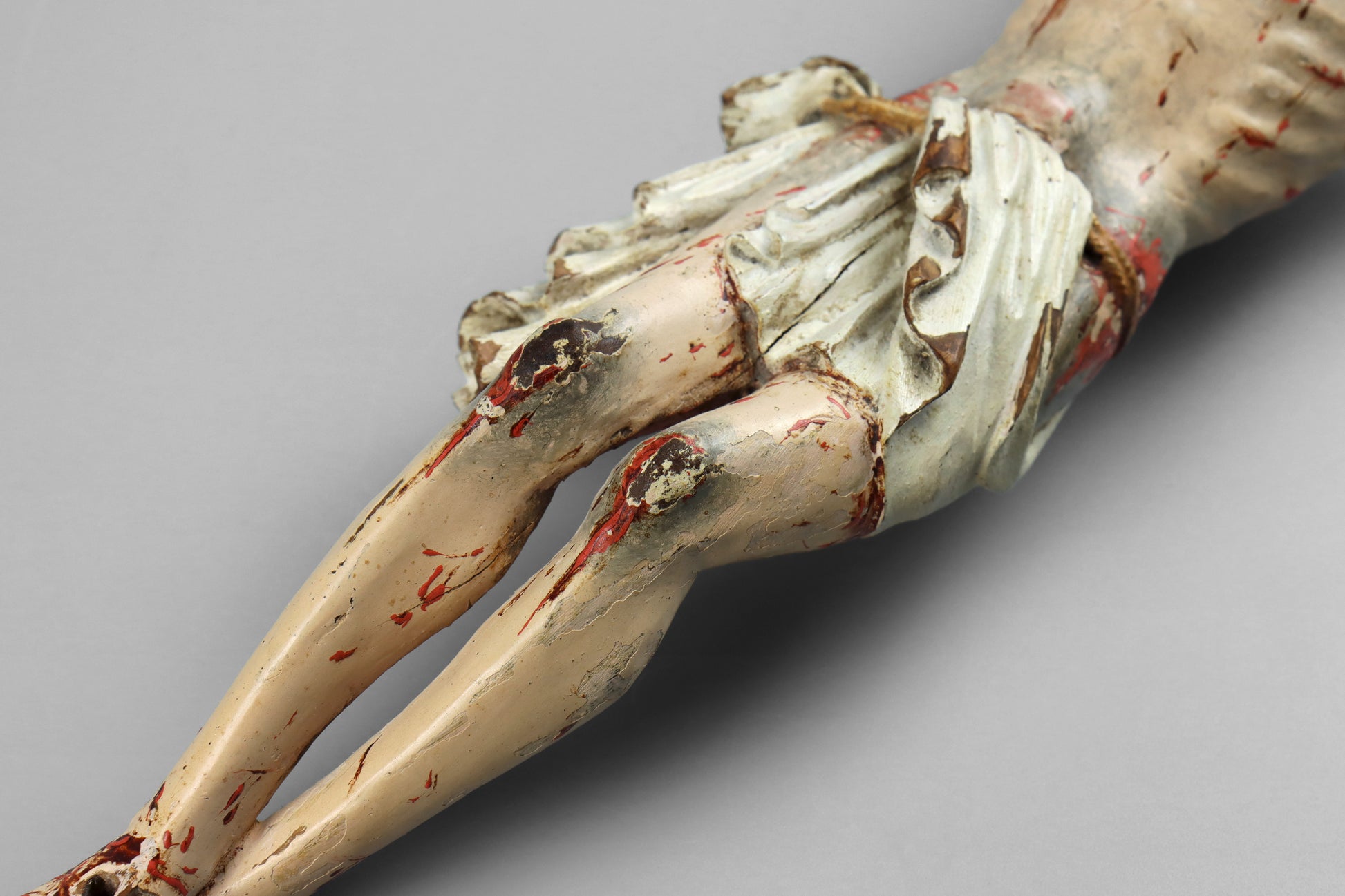 An Indo-Portuguese or Spanish colonial carved wood and polychrome Corpus Christi, dating to the early 18th century. This finely carved Corpus Christi depicts Christ with a downward gaze and his arms outstretched. The piece has excellent polychrome decoration with greying flesh-tones and depicting the many bloody wounds that Christ endured. The piece has good attention to detail and carefully observed anatomy with fine quality carving to the face, the hands, the feet, and the loincloth. There is an old hanging loop to the reverse for display.