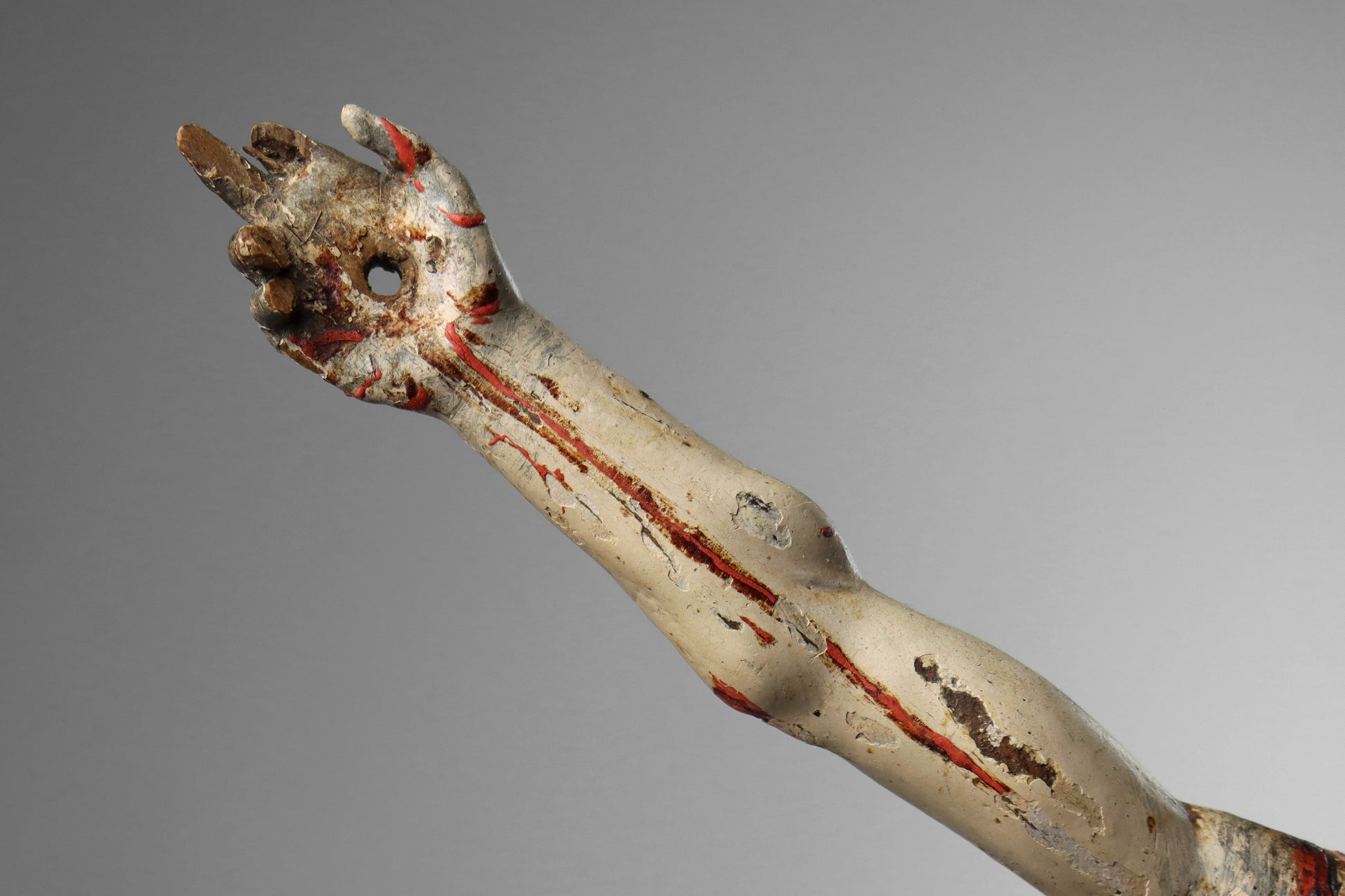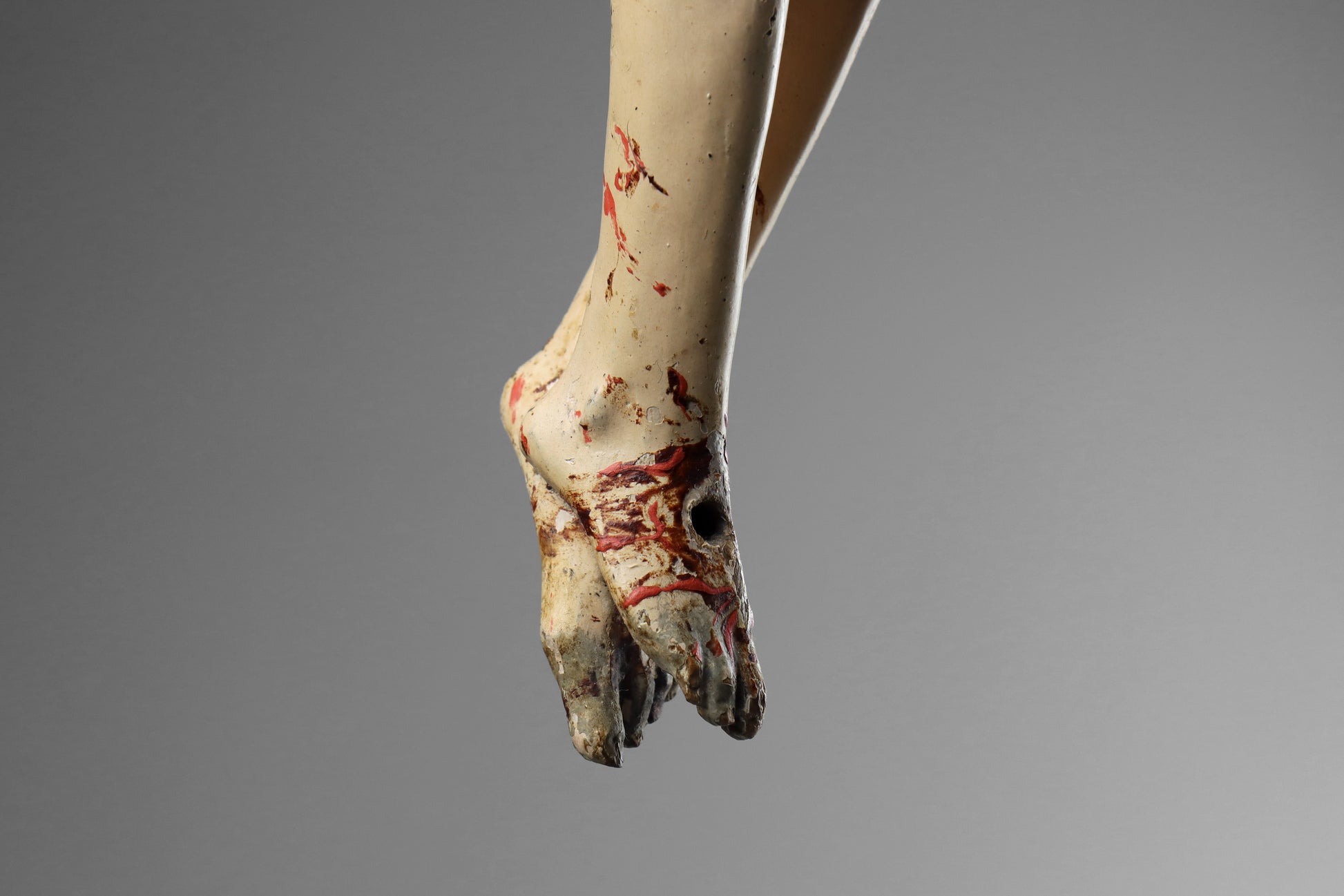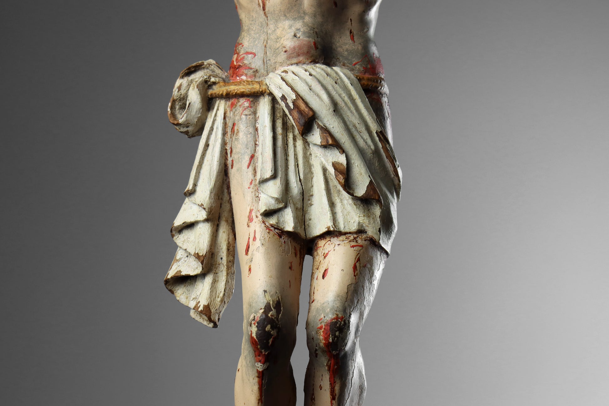 An Indo-Portuguese or Spanish colonial carved wood and polychrome Corpus Christi, dating to the early 18th century. This finely carved Corpus Christi depicts Christ with a downward gaze and his arms outstretched. The piece has excellent polychrome decoration with greying flesh-tones and depicting the many bloody wounds that Christ endured. The piece has good attention to detail and carefully observed anatomy with fine quality carving to the face, the hands, the feet, and the loincloth. There is an old hanging loop to the reverse for display.