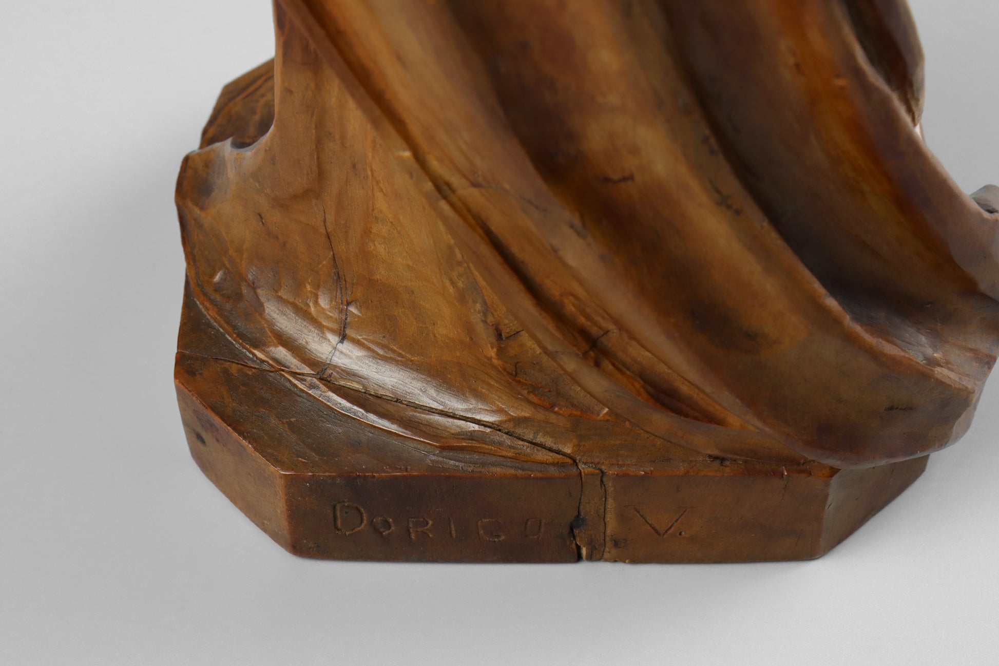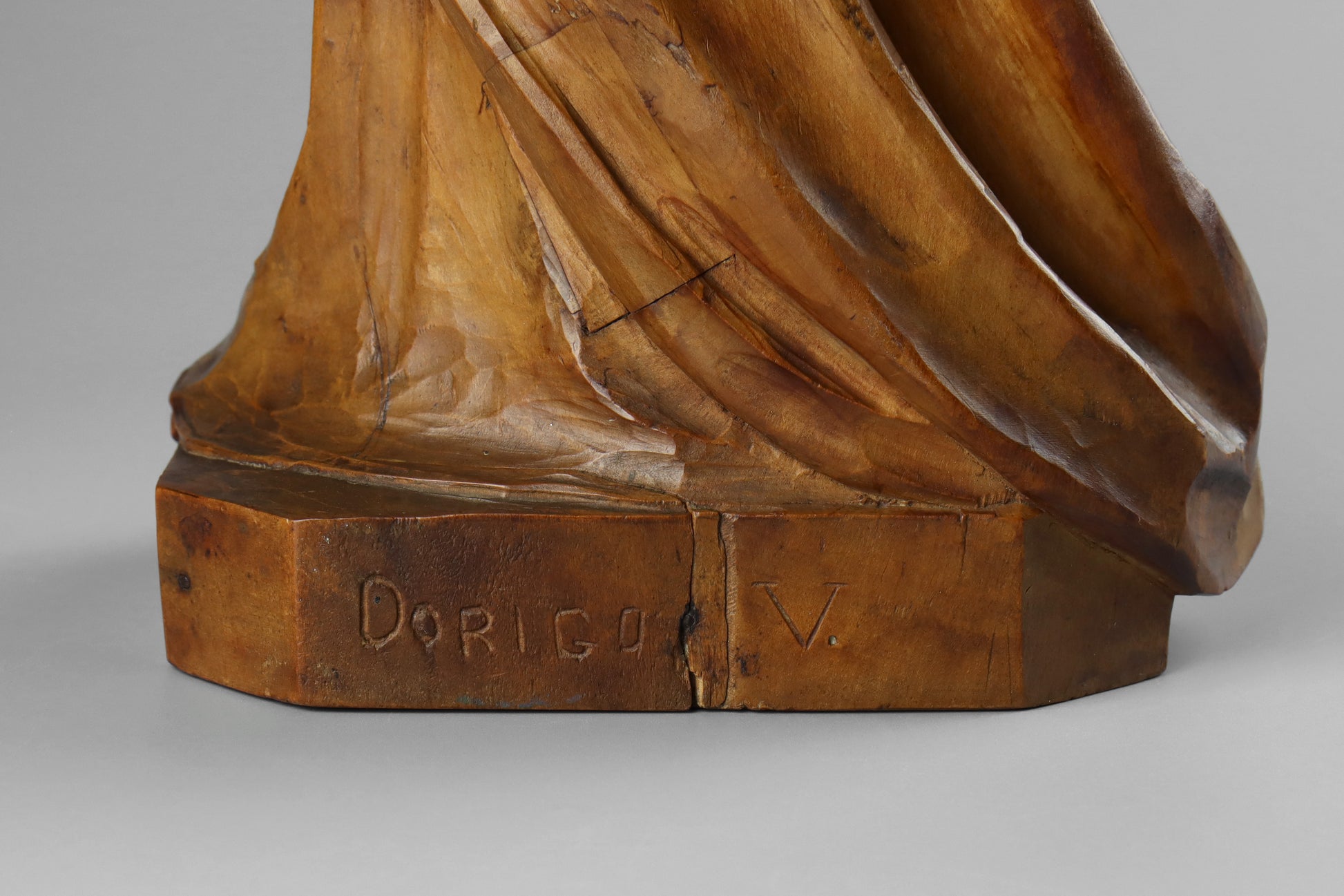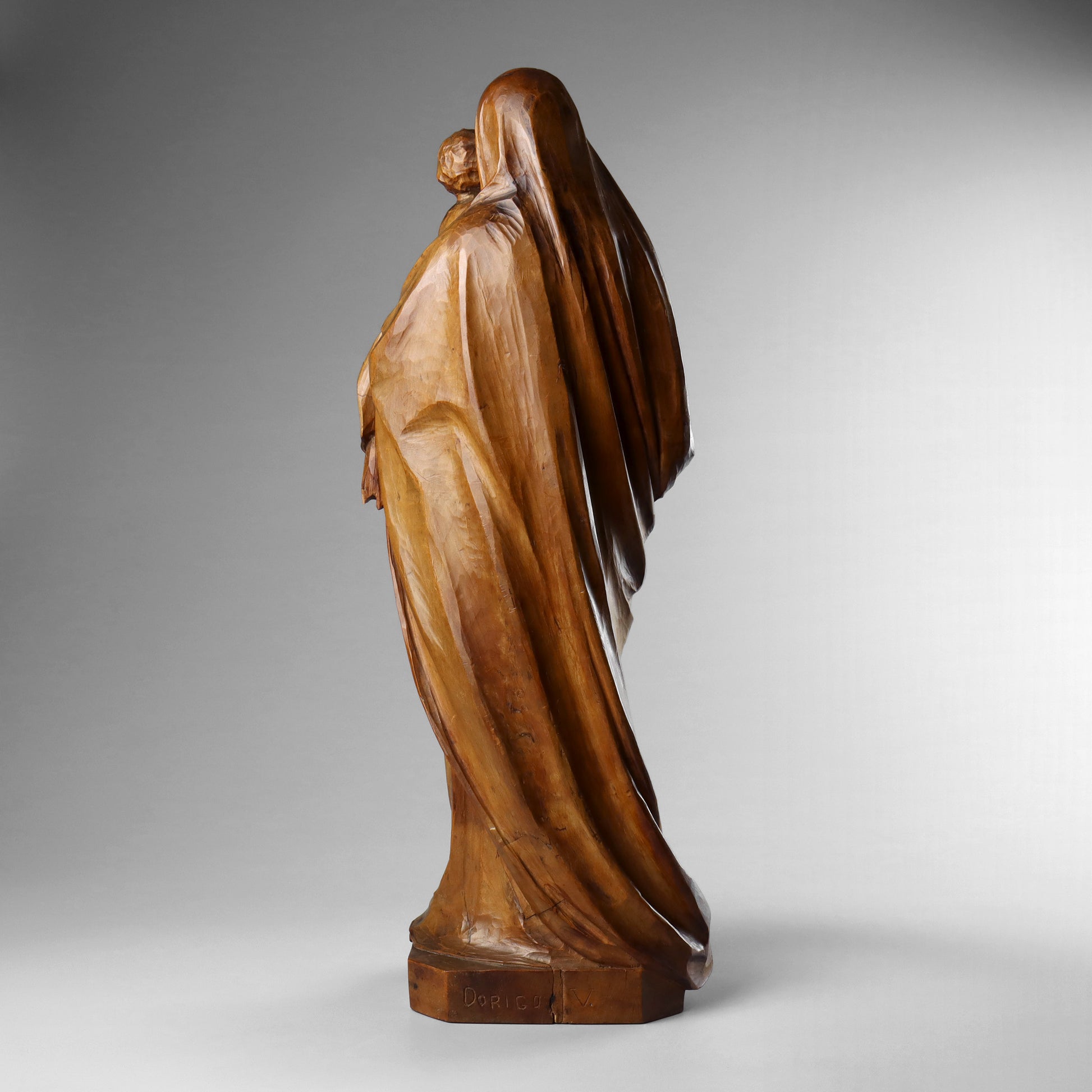 A carved wood statue of the Madonna & Child, dating to the late 19th or early 20th century. This finely carved statue depicts the Virgin Mary dressed in billowing robes and holding the Christ child in her arms. This is a particularly fine carving of good size, colour and patina. There is an inscription of the reverse, possibly a signature reading “Dorigo V”.