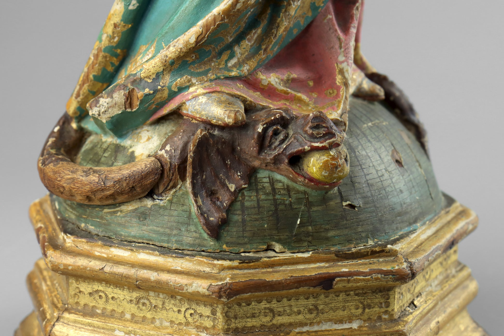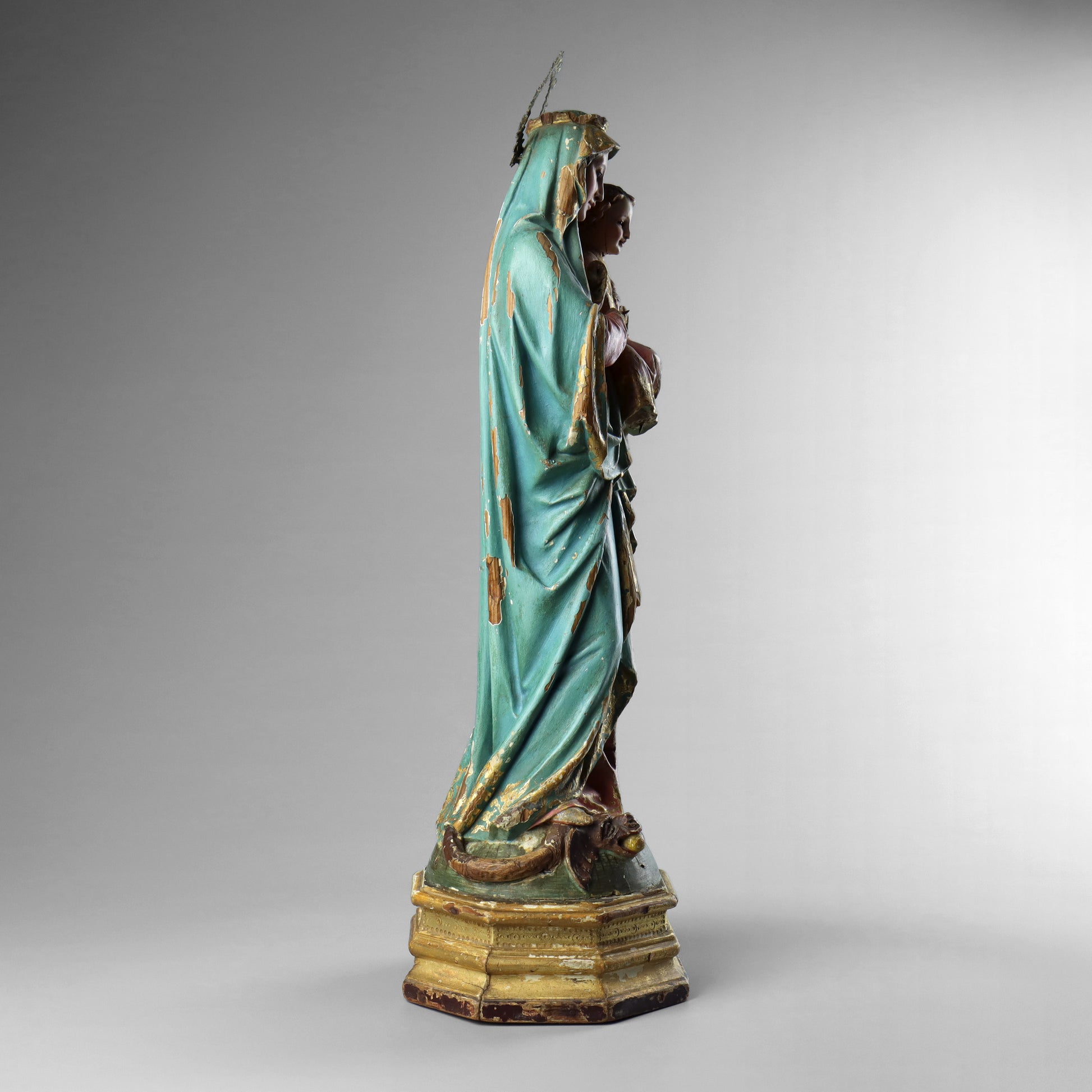 A carved wood & polychrome statue of the Madonna & Child, dating to the late 19th century. This finely carved statue depicts the Madonna with glass eyes and a brass halo, dressed in robes and holding the Christ child in her arms. The Madonna is stood upon a serpent that is coiled around a globe, representing Mary triumphing over sin. The piece has a polychrome finish with the Madonna's robes painted in blue, pink and gilded details. The Christ child has glass eyes and is dressed in pink with gilded details. The statue is fixed upon an octagonal gilded base.