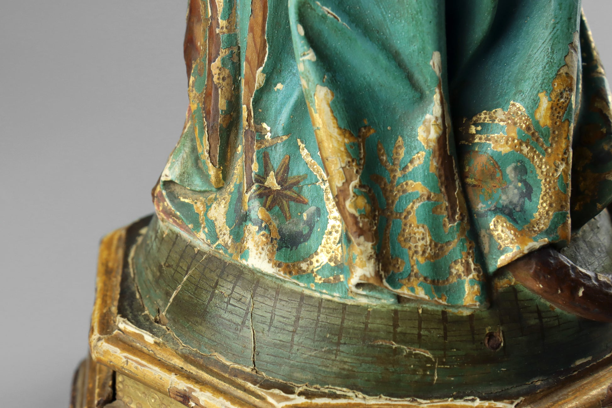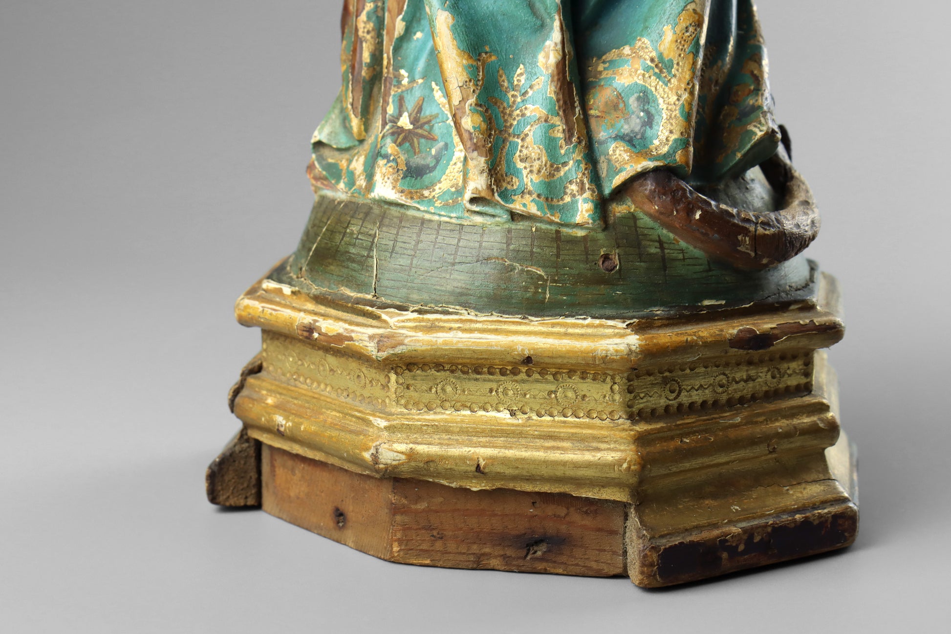 Christ is missing both hands and a foot. Madonna is missing one hand and has some chips to her crown. There are multiple areas of loss to the polychrome throughout revealing the wood beneath and making the statue slightly “distressed” condition. Two small pieces of the back of base missing. Despite the condition issues the statue displays well. Age related wear as expected. Overall good. Please examine photos carefully.