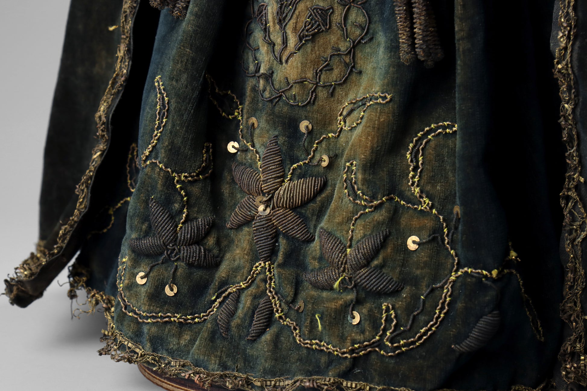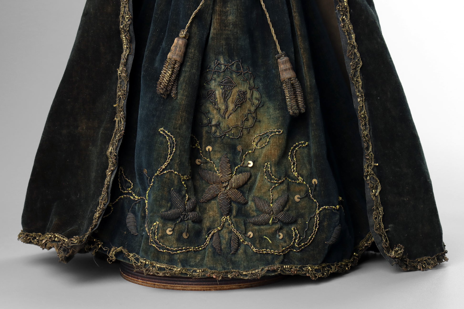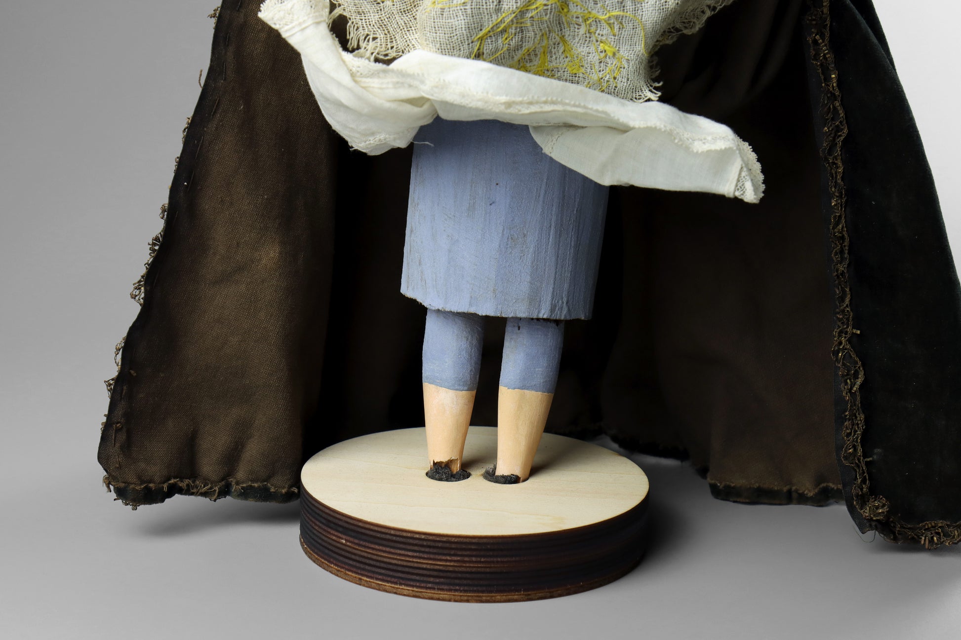 A Spanish carved wood & polychrome statue of the Virgin Mary, dating to the late 19th century. This finely carved statue depicts the Virgin Mary as “Our Lady of Sorrows” and is dressed in lace and embroidered black velvet clothes. The statue has a finely carved and painted head that also has glass eyes. The hands are particularly well carved with great detail to the fingers. The body of the statue appears to be of basic wooden construction painted blue and has been later fixed to a modern circular base.