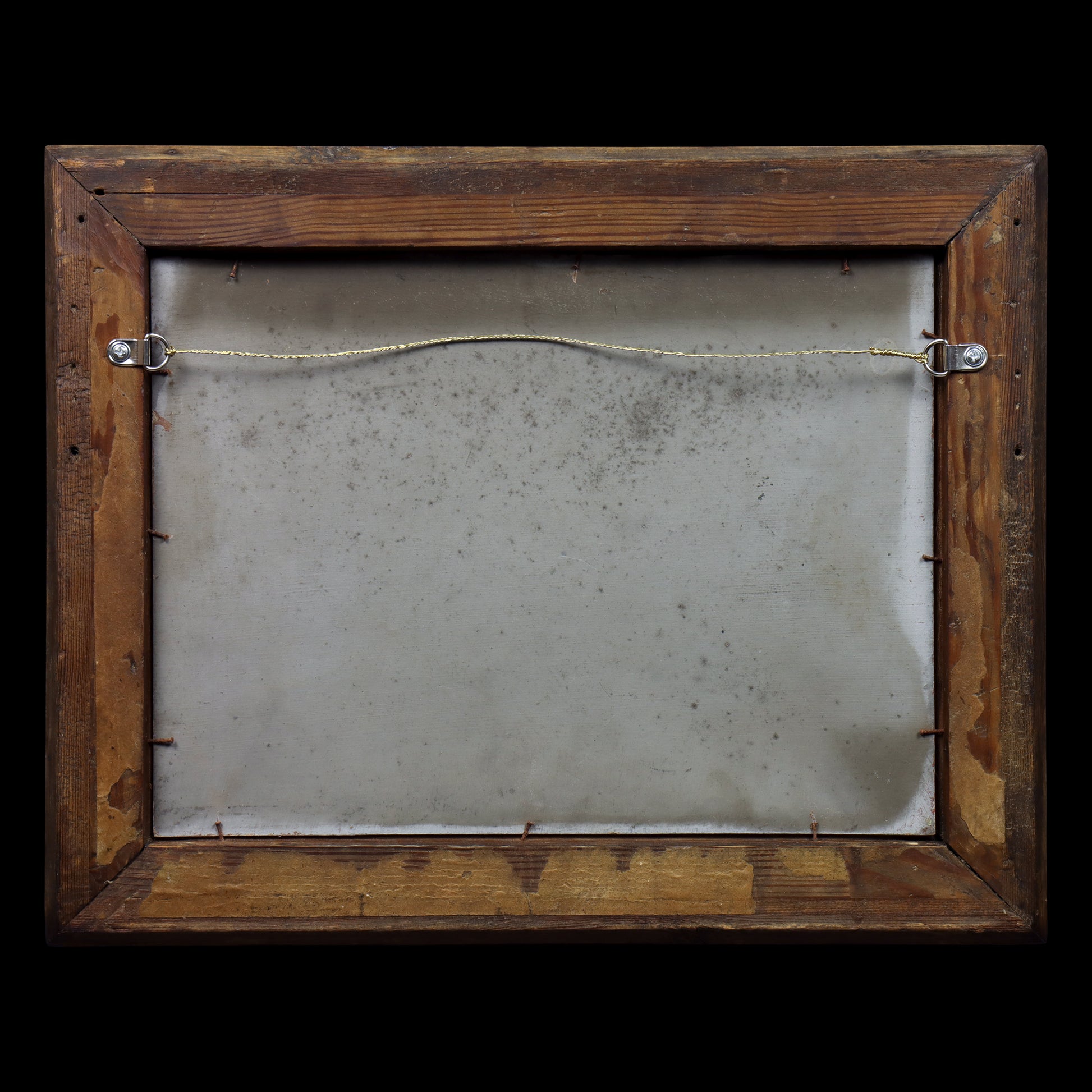 The frame is slightly “distressed” with the gilt rubbed through in areas and some minor losses. Age related wear as expected. Overall in good ready to hang condition. Please examine photos carefully.