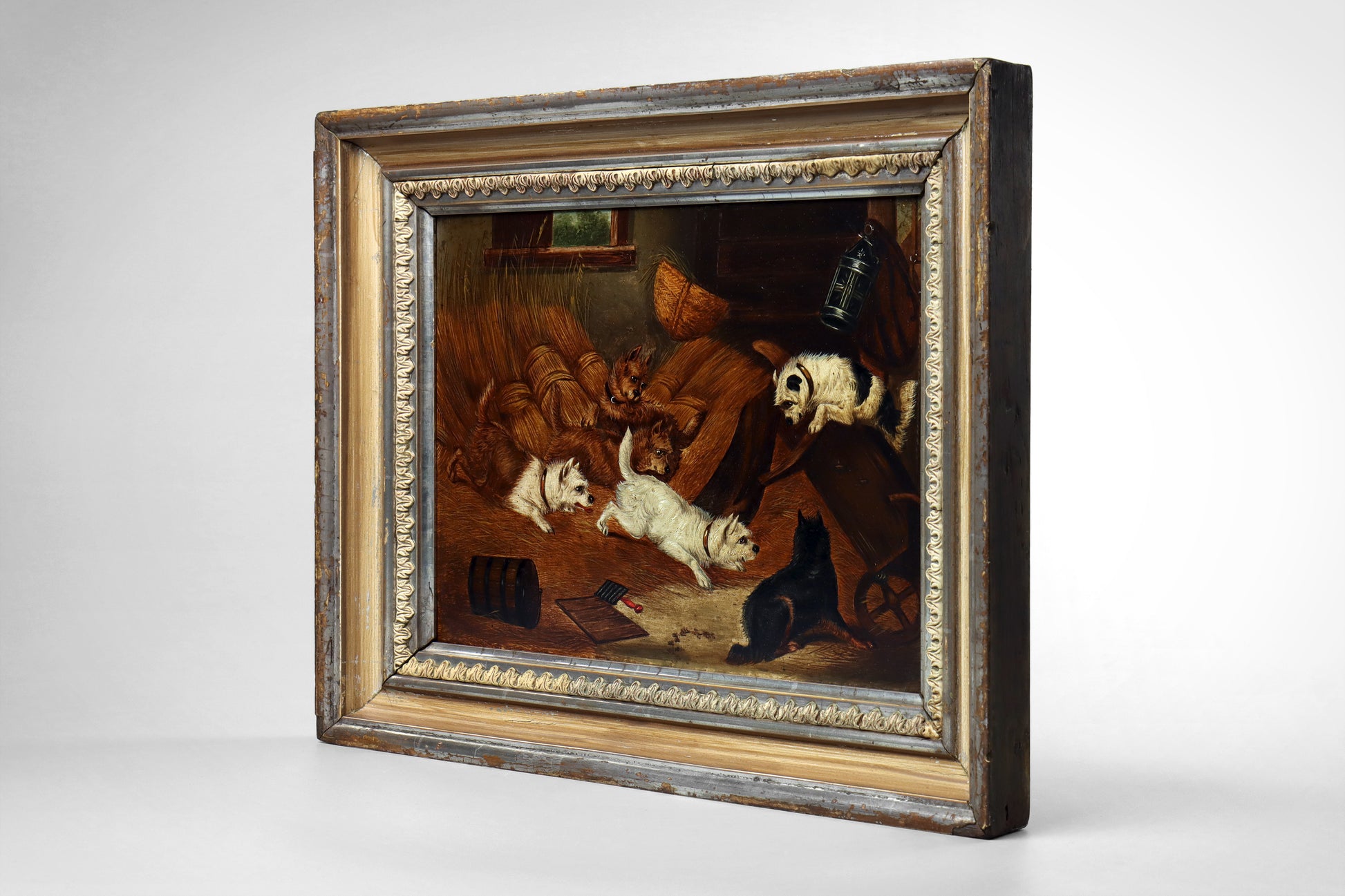 A painting of Terriers ratting in a barn, dating to the second half of the 19th century. Oil on board and presented in a period silver gilt & painted frame. This fine quality painting is after or from the circle of George Armfield and depicts a group of 6 terriers hunting a rat in a barn. There is an incredible amount of detail in the painting and the quality suggests it's by a highly accomplished hand.