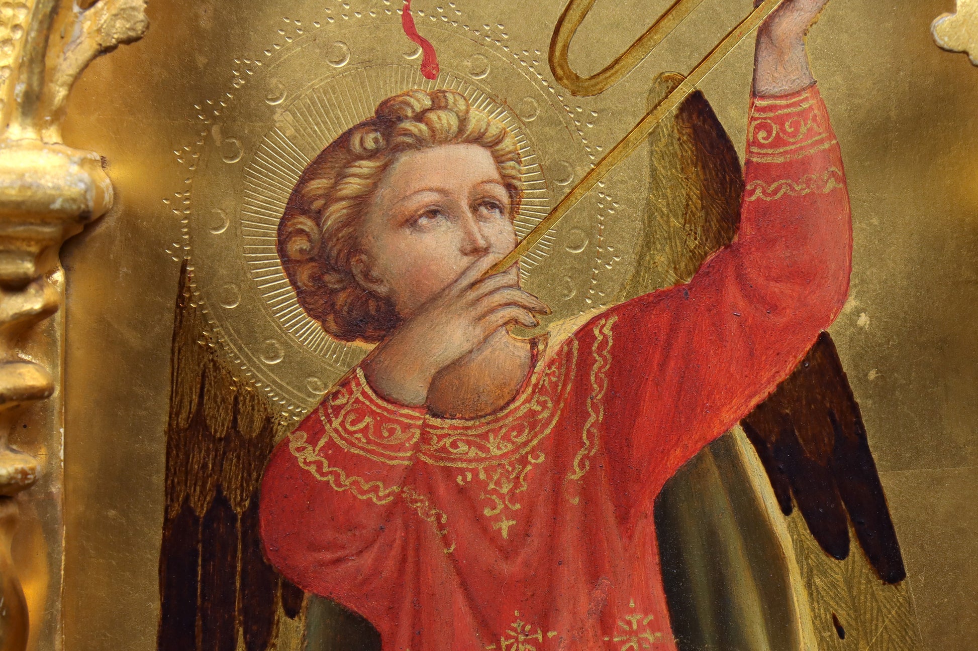 A pair of Florentine paintings of musical angels, dating to the second half of the 19th century. Oil on gilt panels and presented in their original and ornate gothic gilt frames. Each painting depicts an angel with a trumpet, one dressed in red robes and the other in green. These fine quality paintings are faithful 19th century renditions after Fra Angelico, the originals painted during the 15th century. These are a highly decorative pair of paintings with their gothic style architectural/tabernacle frames. One of the paintings has an old Alfredo Candida & Co label on the reverse.