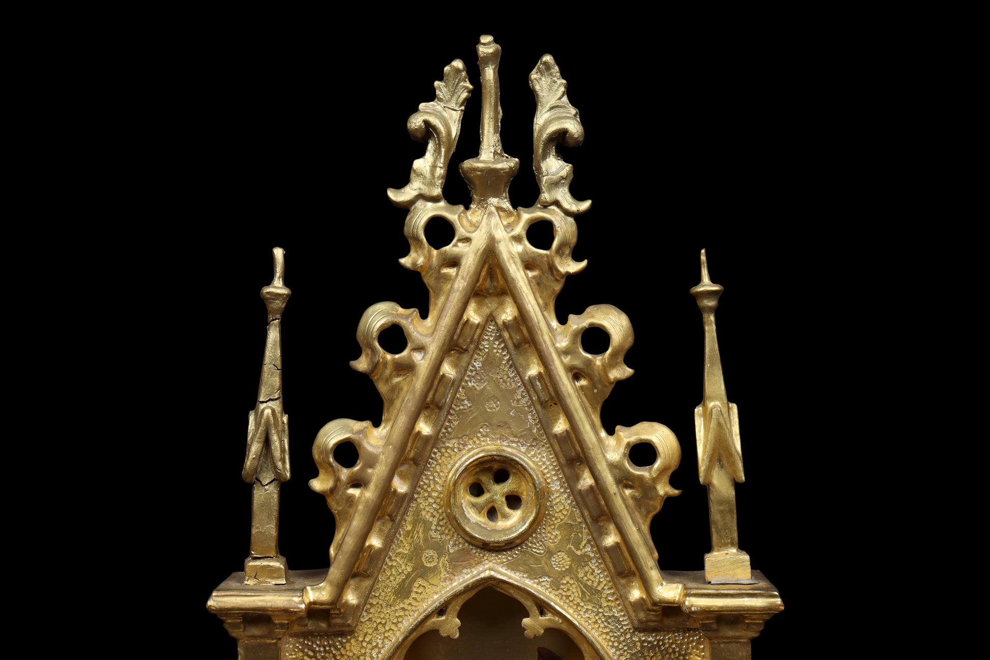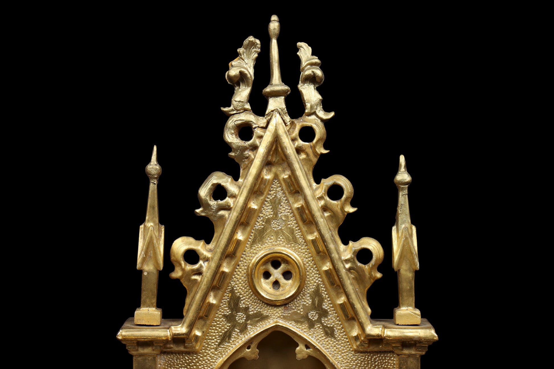 Some faint surface marks. Both frames have some restoration to the top decorative elements and spires that have been rebuilt and regilded. There are some small cracks in areas of the restoration. Age related wear as expected. Overall in good ready to hang condition. Please examine photos carefully.
