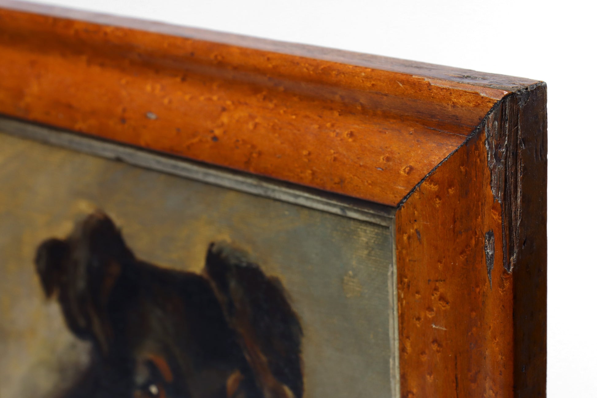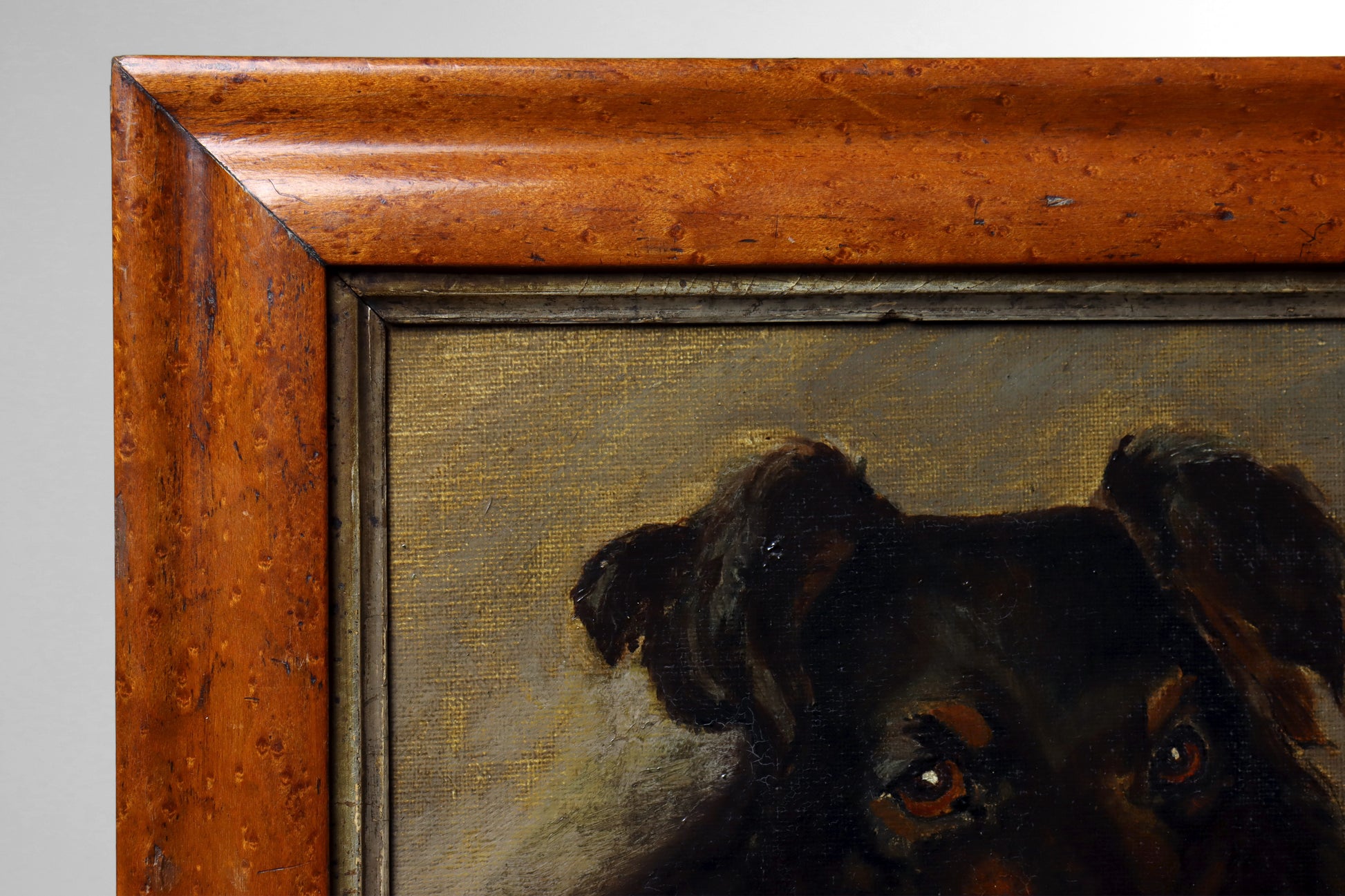 A portrait painting of a Border Collie, dating to the late 19th or early 20th century. Oil on canvas laid to panel and presented in a period maple veneer frame with gilt slip. This fine quality painting depicts a portrait of a black and tan Border Collie that has a lot of charm and is in ready to hang condition.