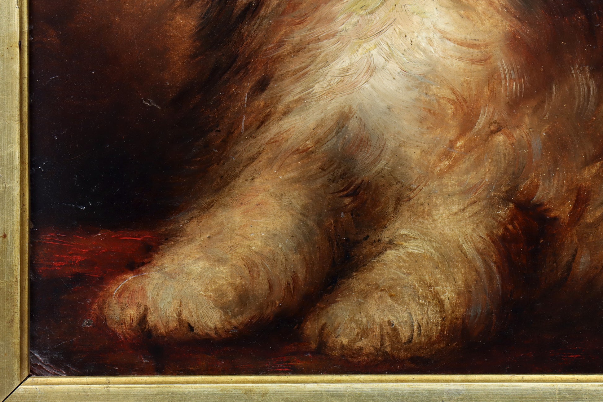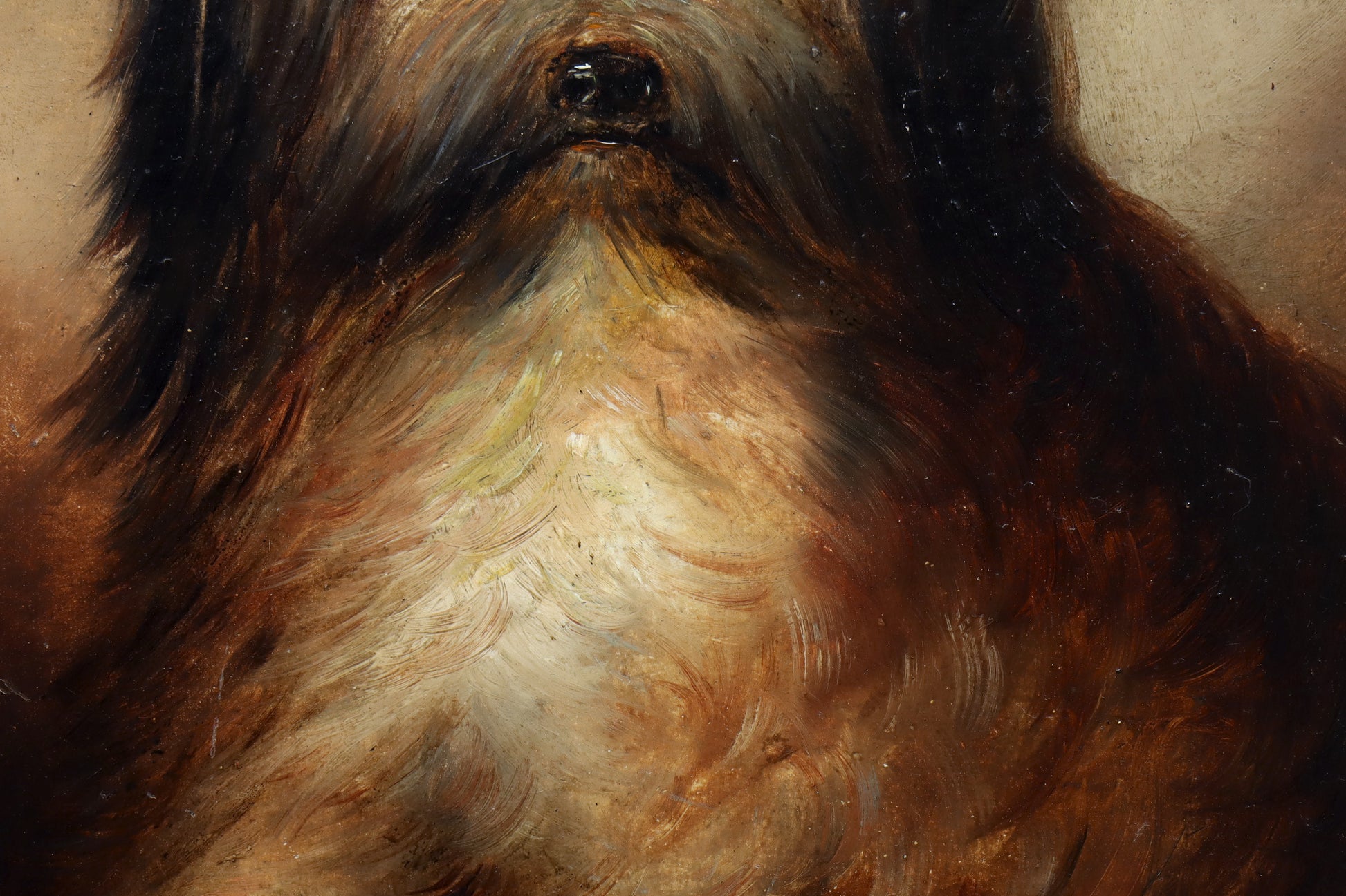 A portrait painting of a long-haired Terrier or possibly a Maltese, dating to the second half of the 19th century. Oil on board and presented in a late 20th century gilt frame (retaining a 19th century gilt slip). This fine quality painting depicts a portrait of a long-haired Terrier or Maltese, seated in an interior. There is a slight folk-art/naive charm to this painting and it has great appeal.