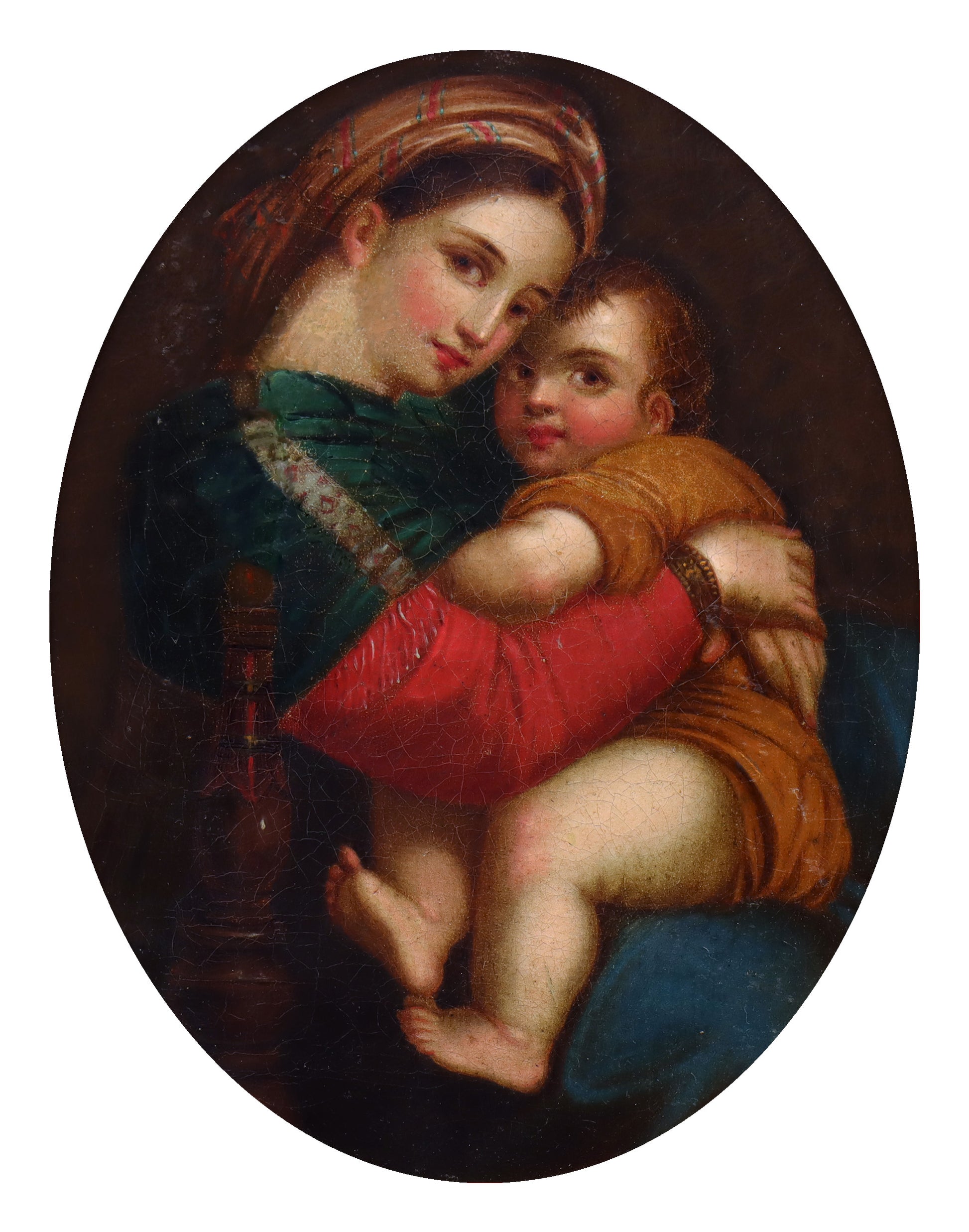A painting of the Madonna della Seggiola, dating to the 19th century. Oil on canvas and presented in a 19th century gilt frame. This fine quality painting is after Raphael's famous Renaissance masterpiece, originally painted circa 1513-1514. This version offered is a faithful 19th century rendition that depicts the Virgin Mary embracing the Christ child. This is a good painting that has been well cared for and recently relined.